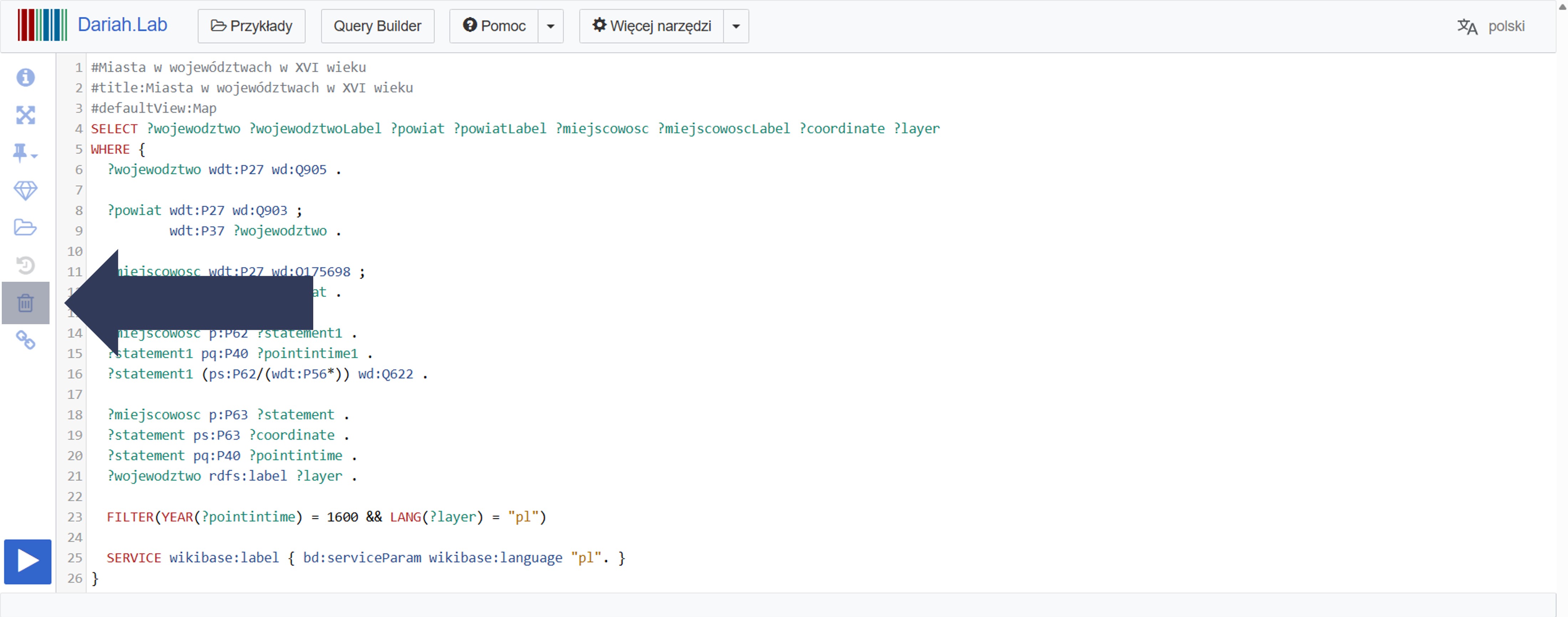 - W pasku bocznym po lewej stronie okna edytora kliknij przycisk z symbolem kosza.