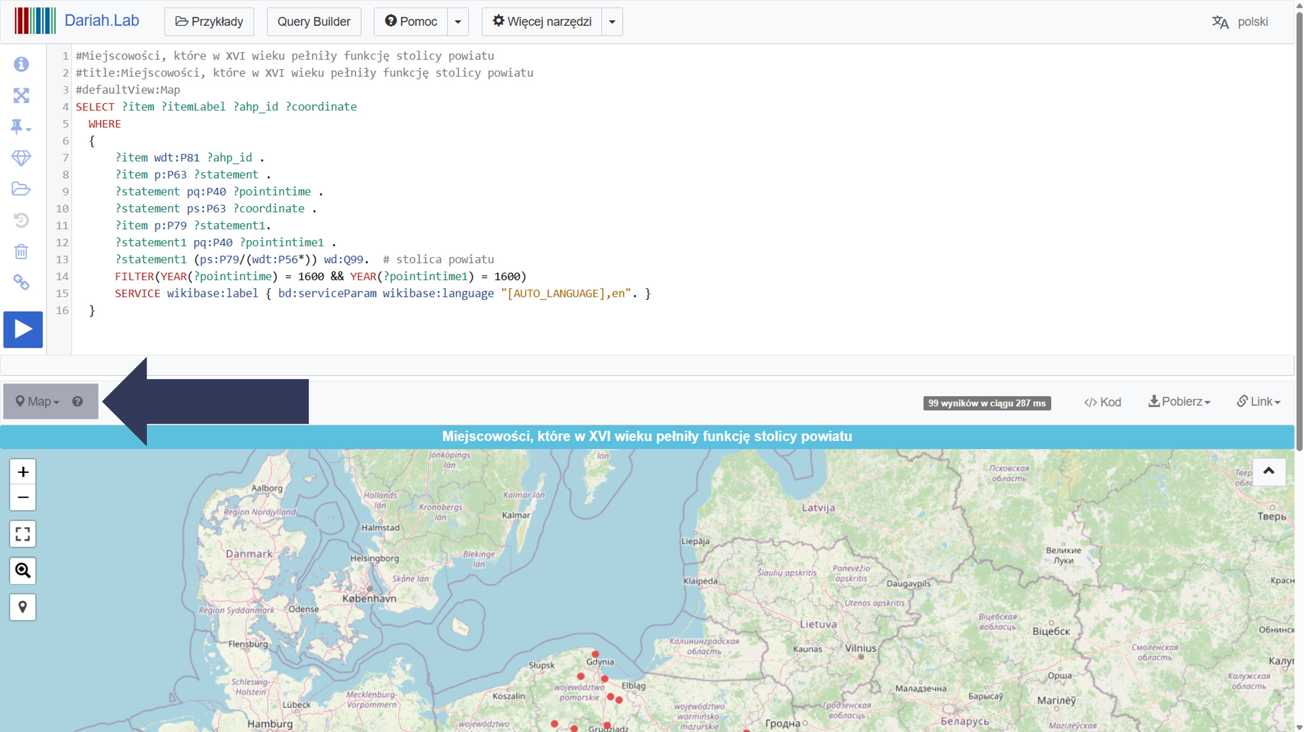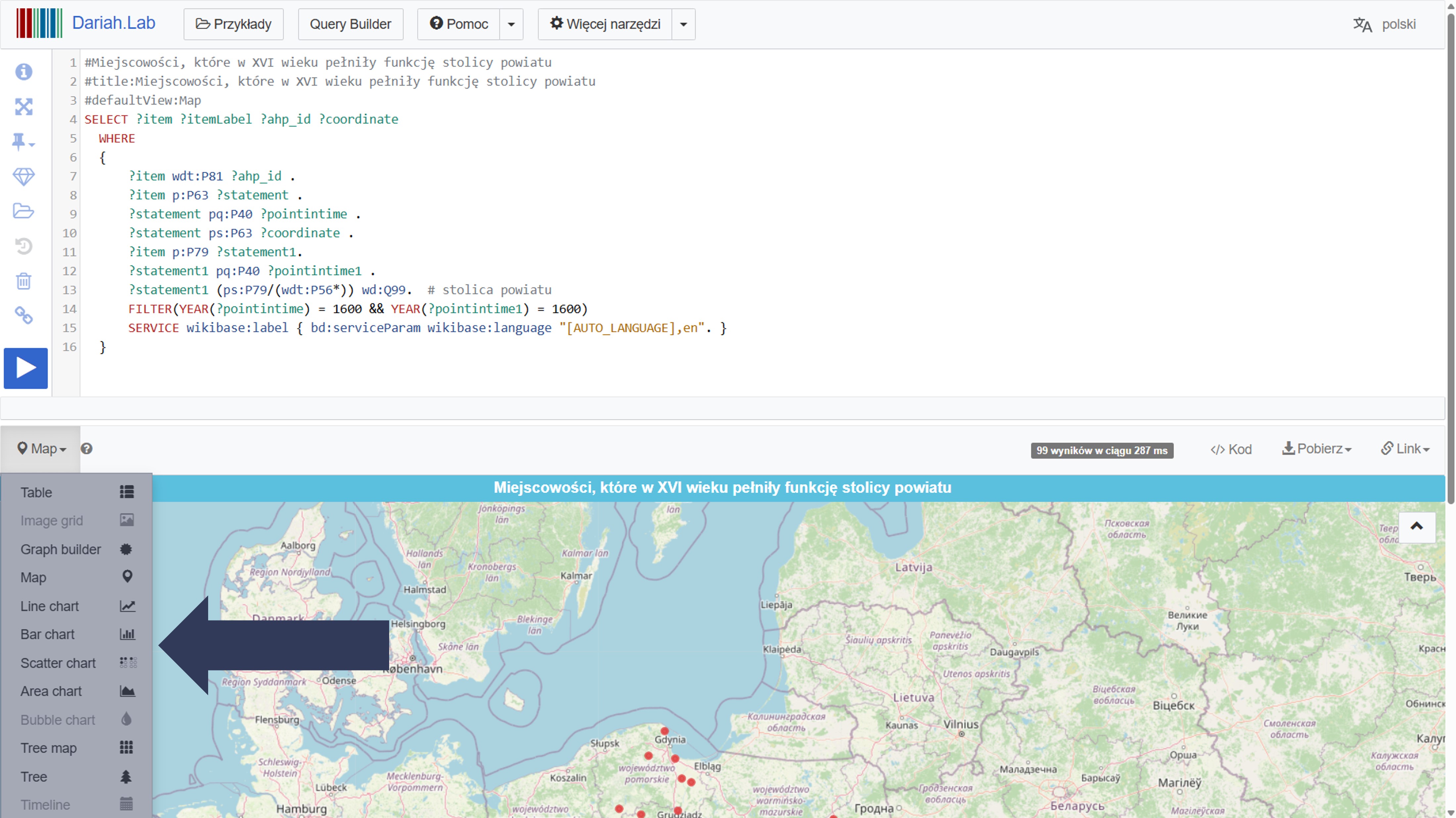 Uwaga: wybrany sposób wizualizacji zadziała tylko wtedy, gdy wyniki zapytania zawierają odpowiednie dane – np. widok mapy wymaga, aby w wynikach SPARQL znajdowało się pole ze współrzędnymi geograficznymi.