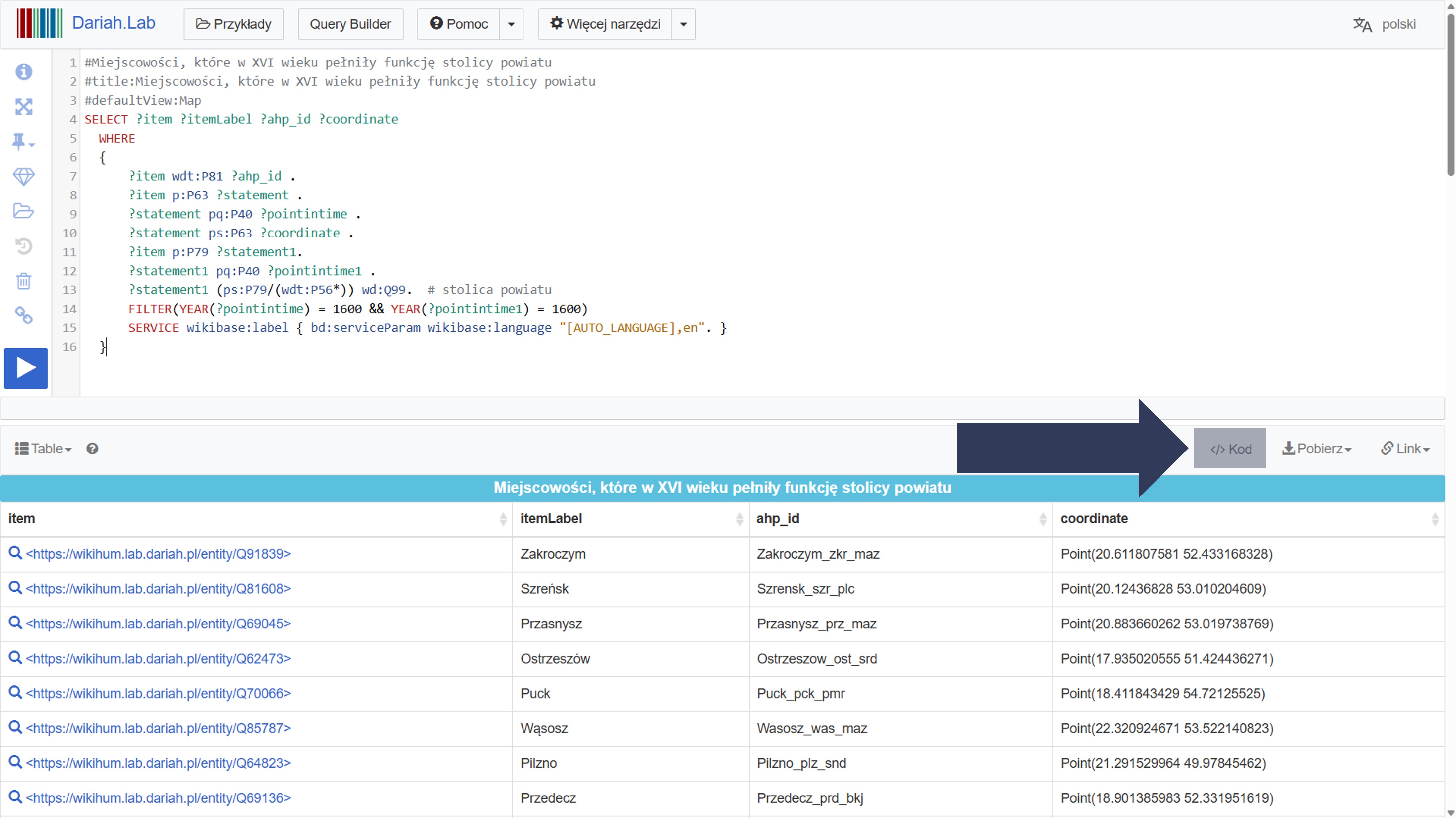 - Na pasku narzędzi wyników kliknij przycisk Kod.