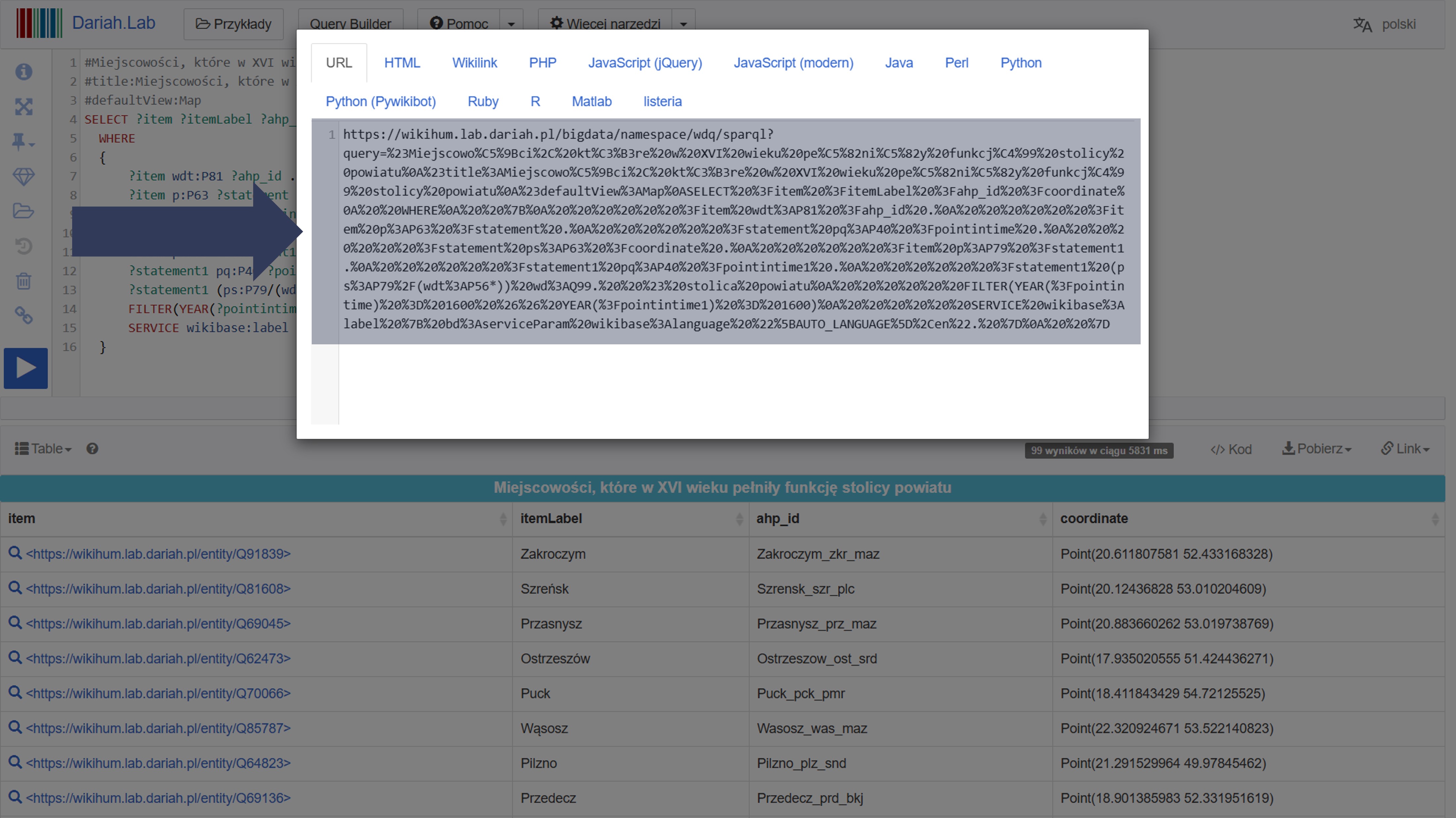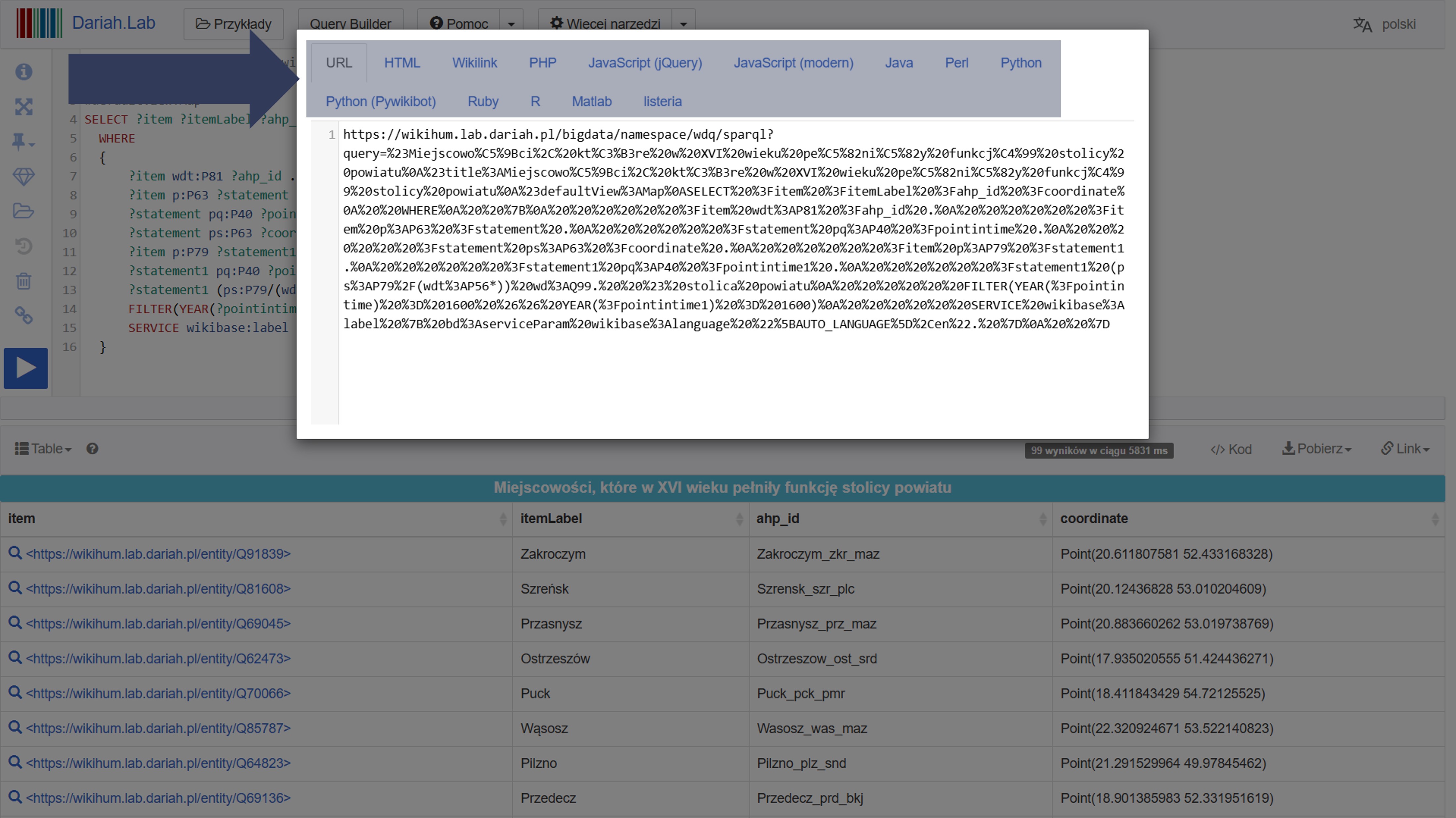 Wikidata Query Service pozwala automatycznie wygenerować gotowy fragment kodu uruchamiający zapytanie SPARQL w różnych językach programowania. Dzięki temu można łatwo pobrać dane z Wikidaty bez pisania kodu od podstaw. Wystarczy skopiować gotowy kod do swojego środowiska, np. Pythona lub R.