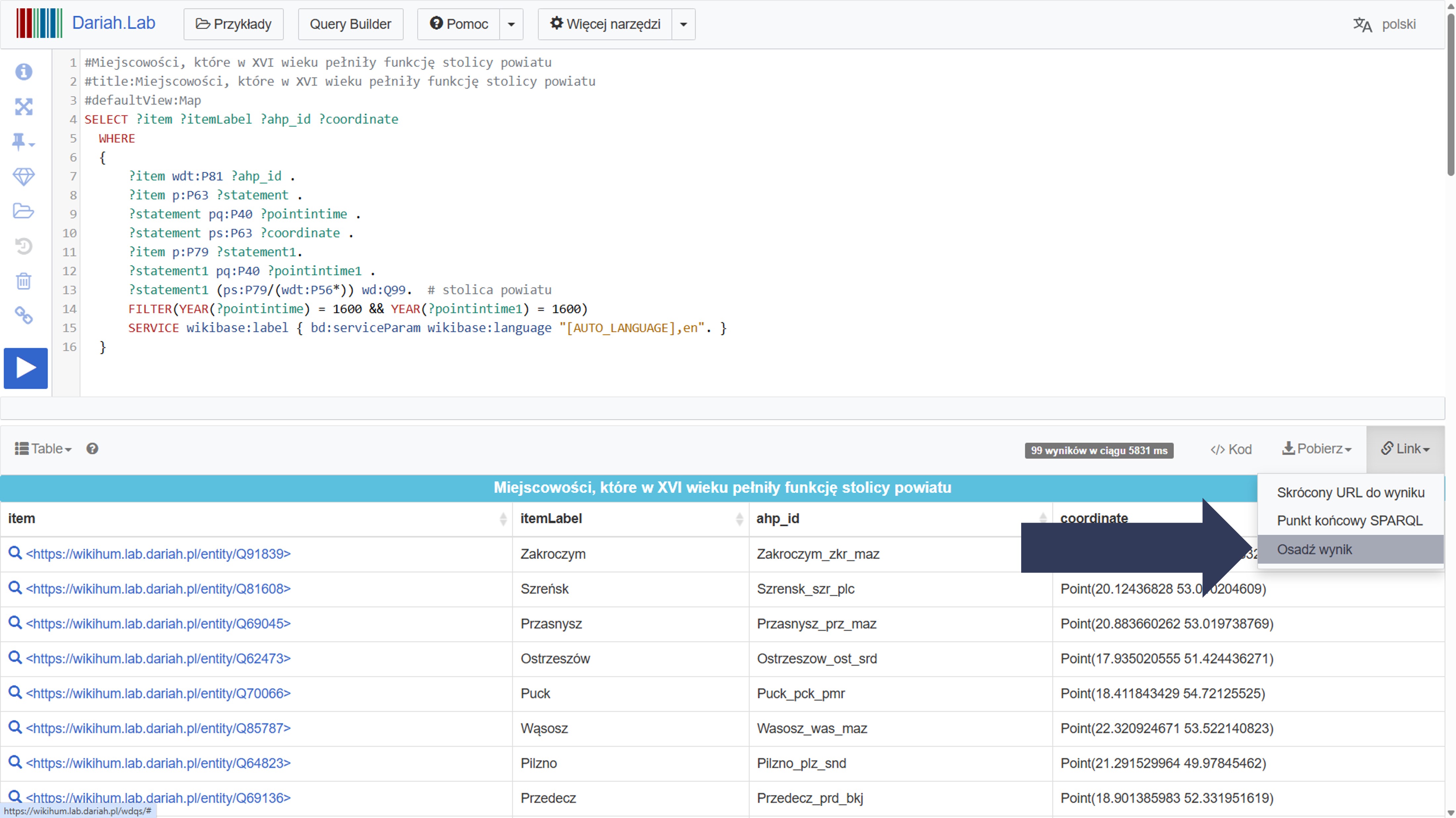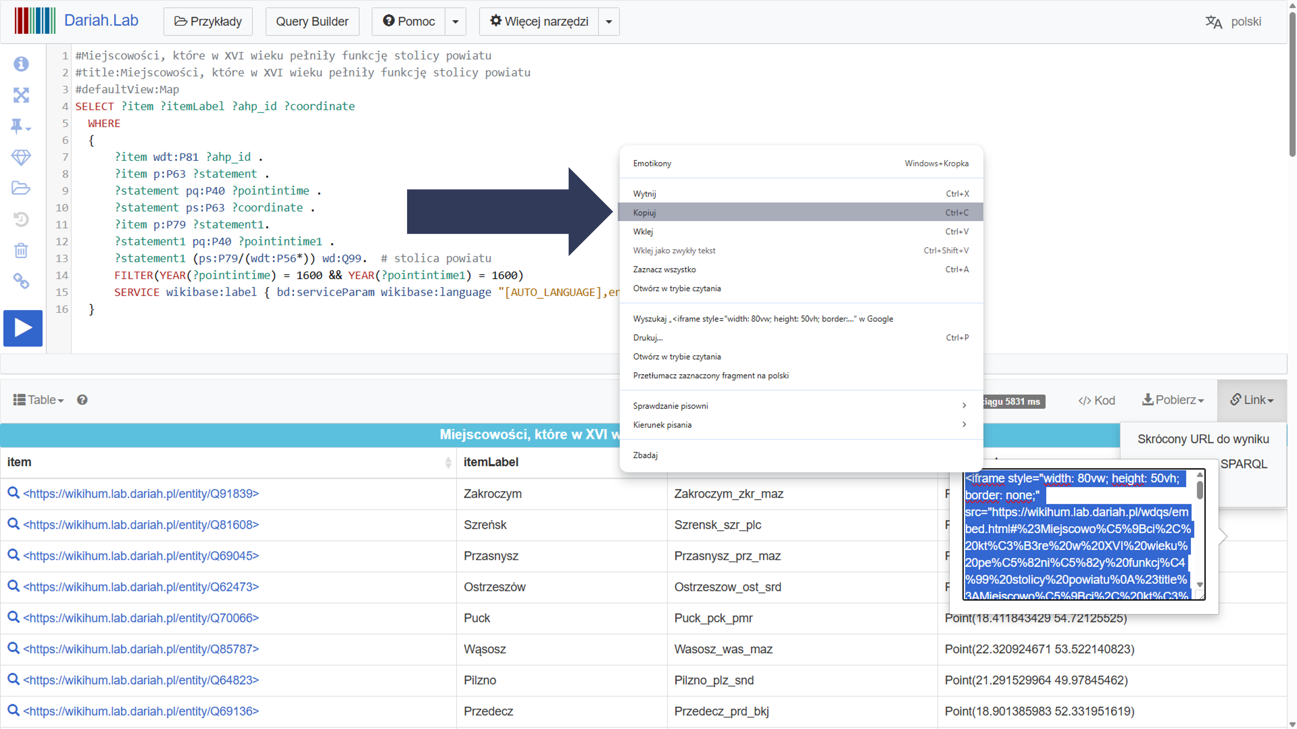 Kod HTML (iframe) umożliwia osadzenie wyników zapytania w bieżącej formie prezentacji (np. tabela, mapa) na stronie internetowej lub w prezentacji.