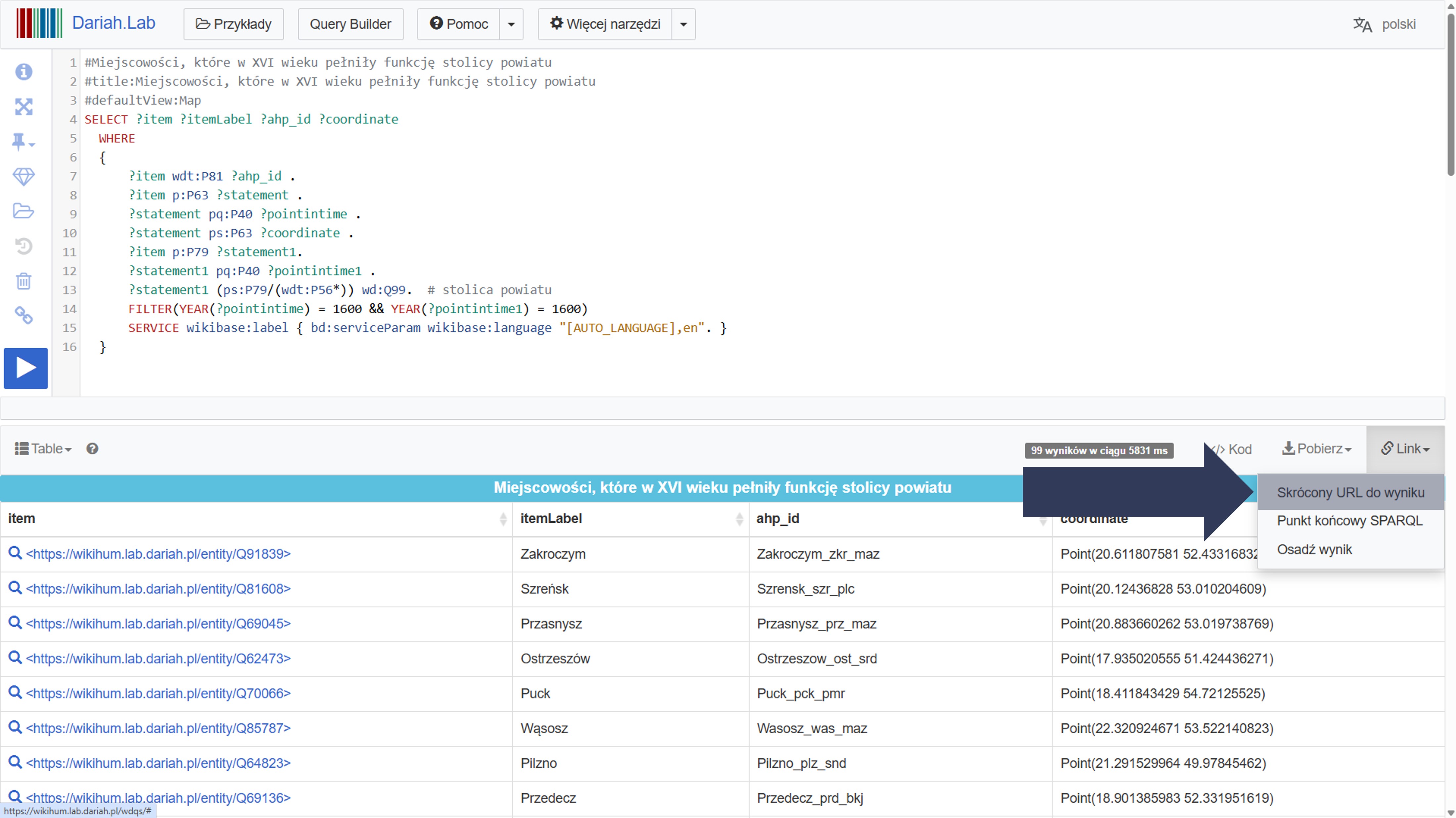 Adres URL prowadzi bezpośrednio do zapytania wraz z wynikami.