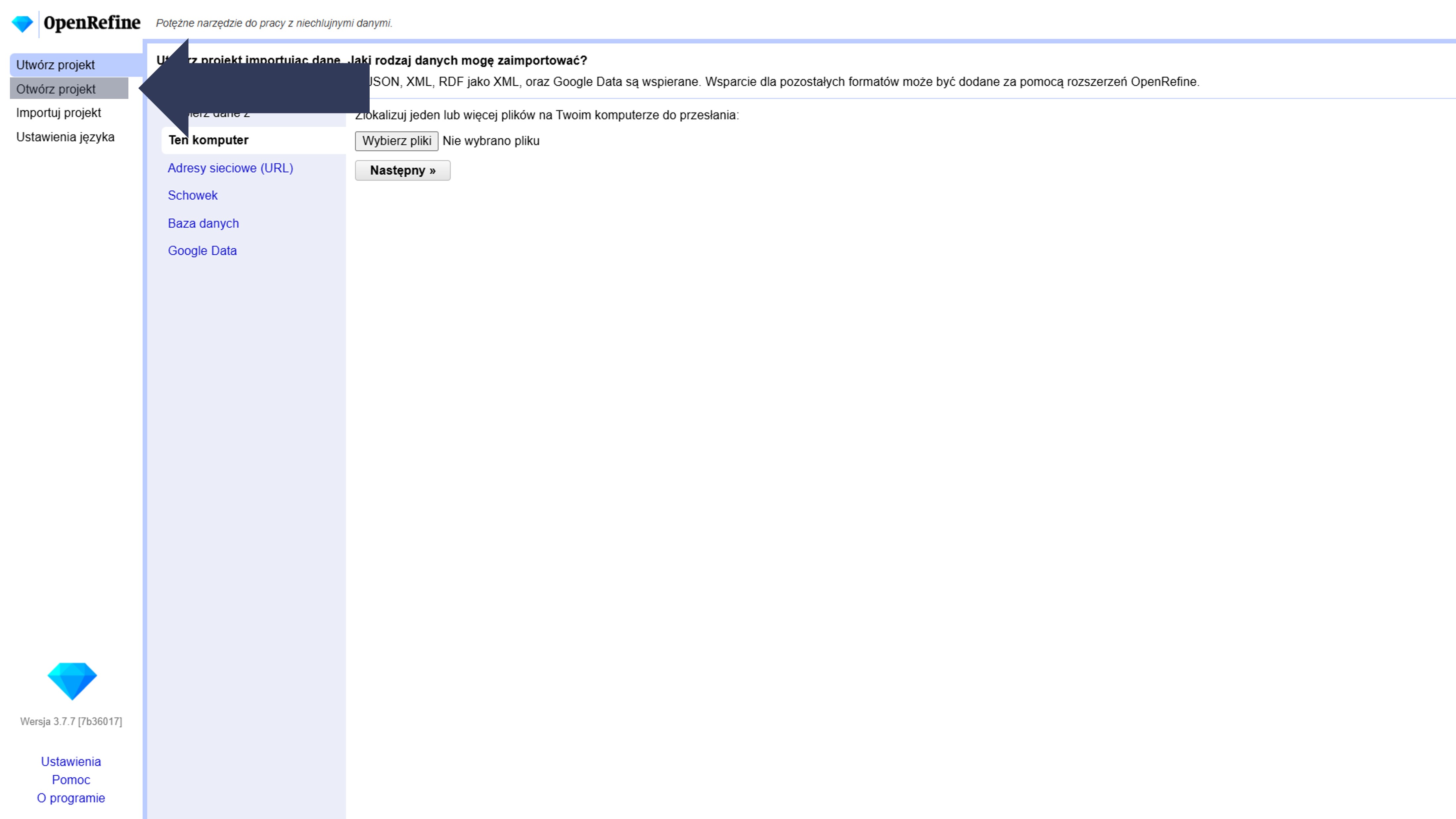 - W menu bocznym kliknij Otwórz projekt.