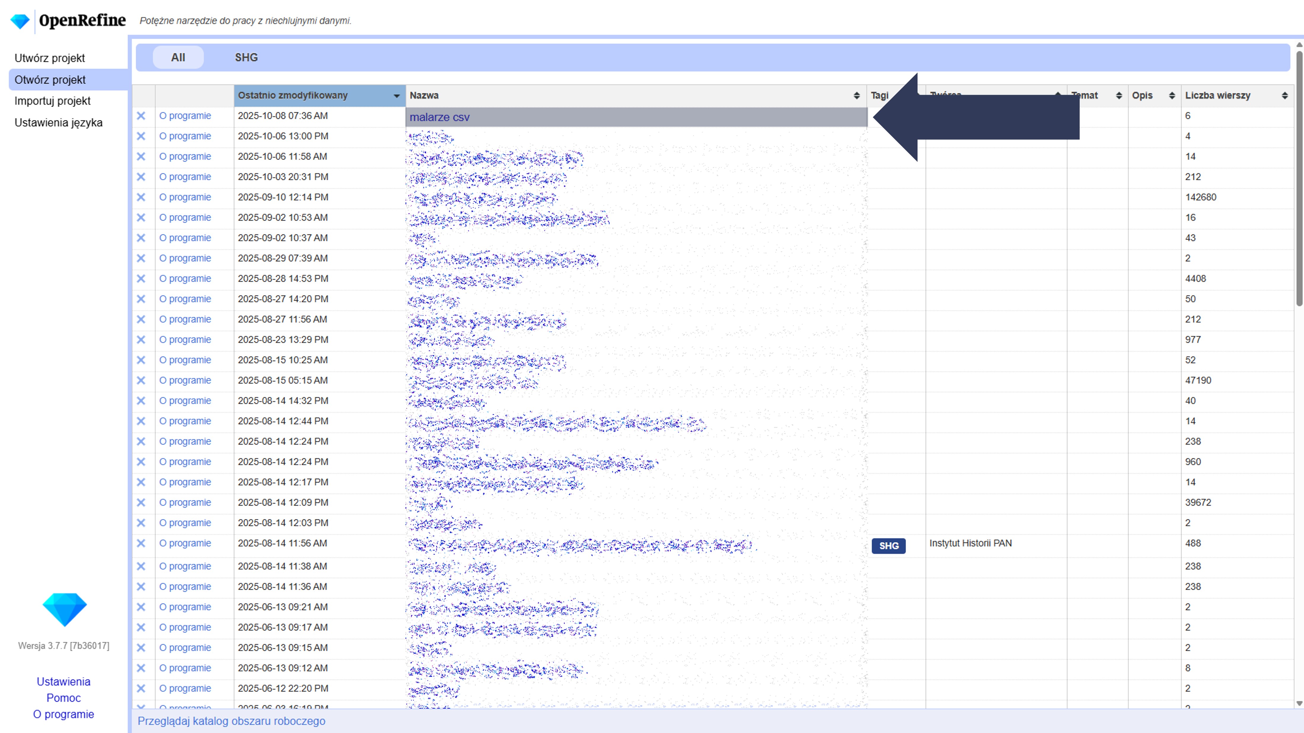 - Na liście projektów kliknij nazwę wybranego projektu w kolumnie Nazwa.