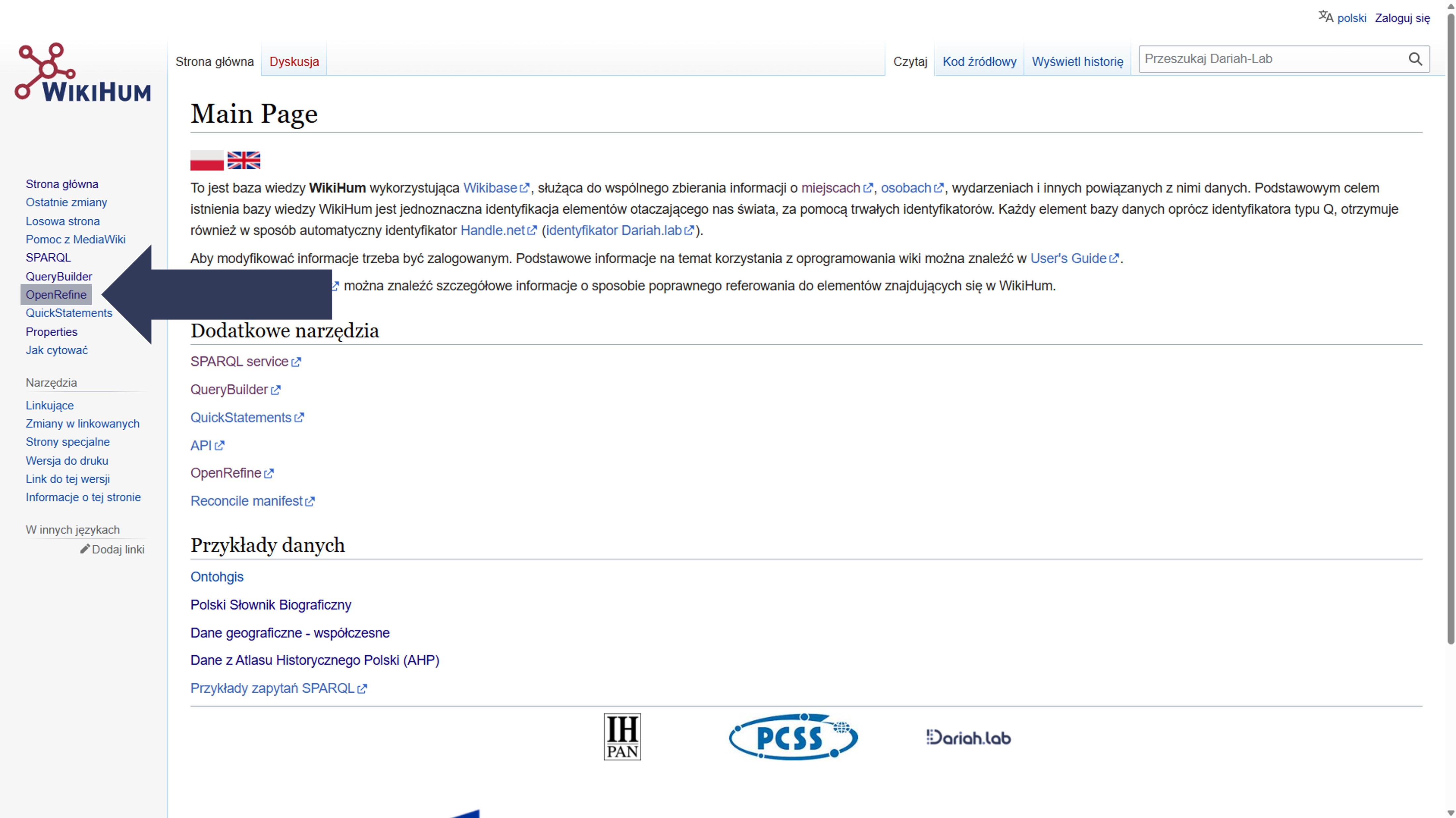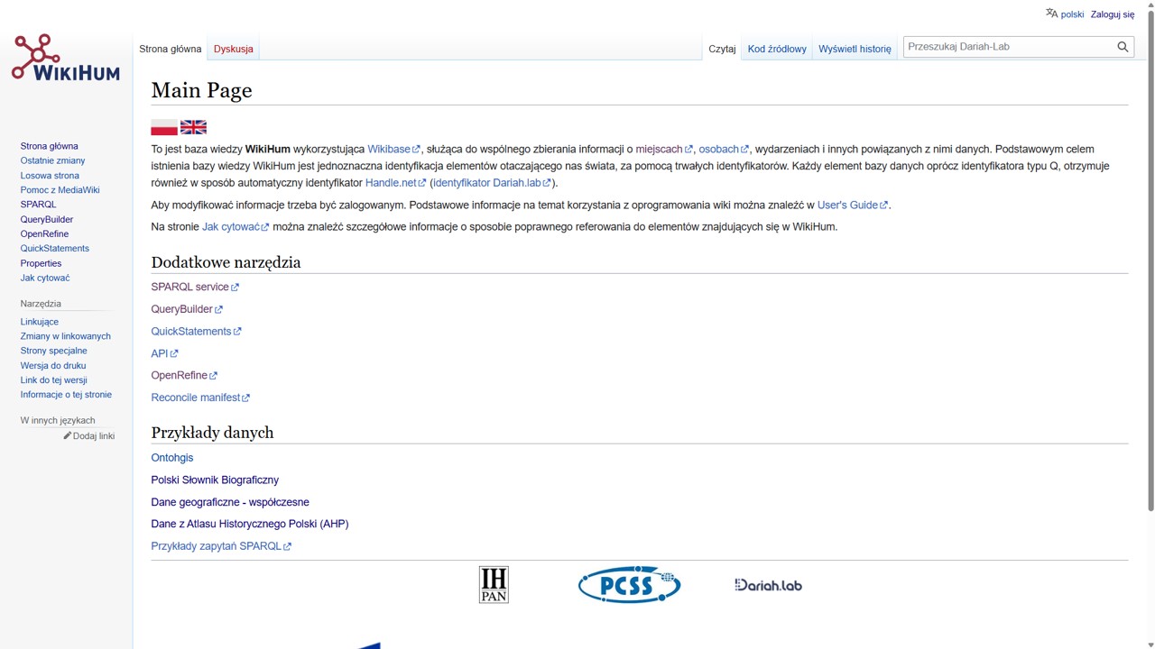 - Wejdź na stronę główną WikiHum: wikihum.lab.dariah.pl.