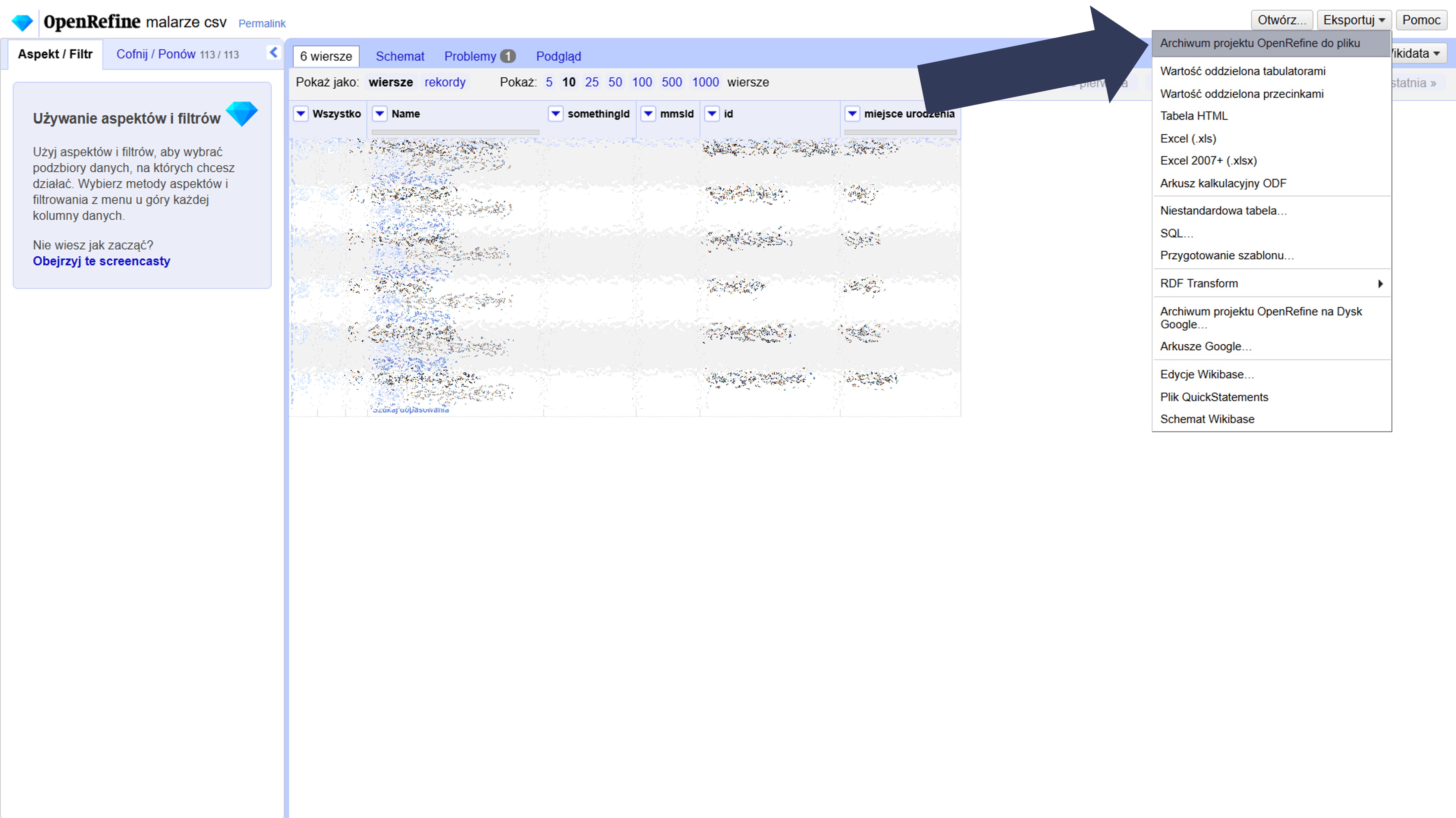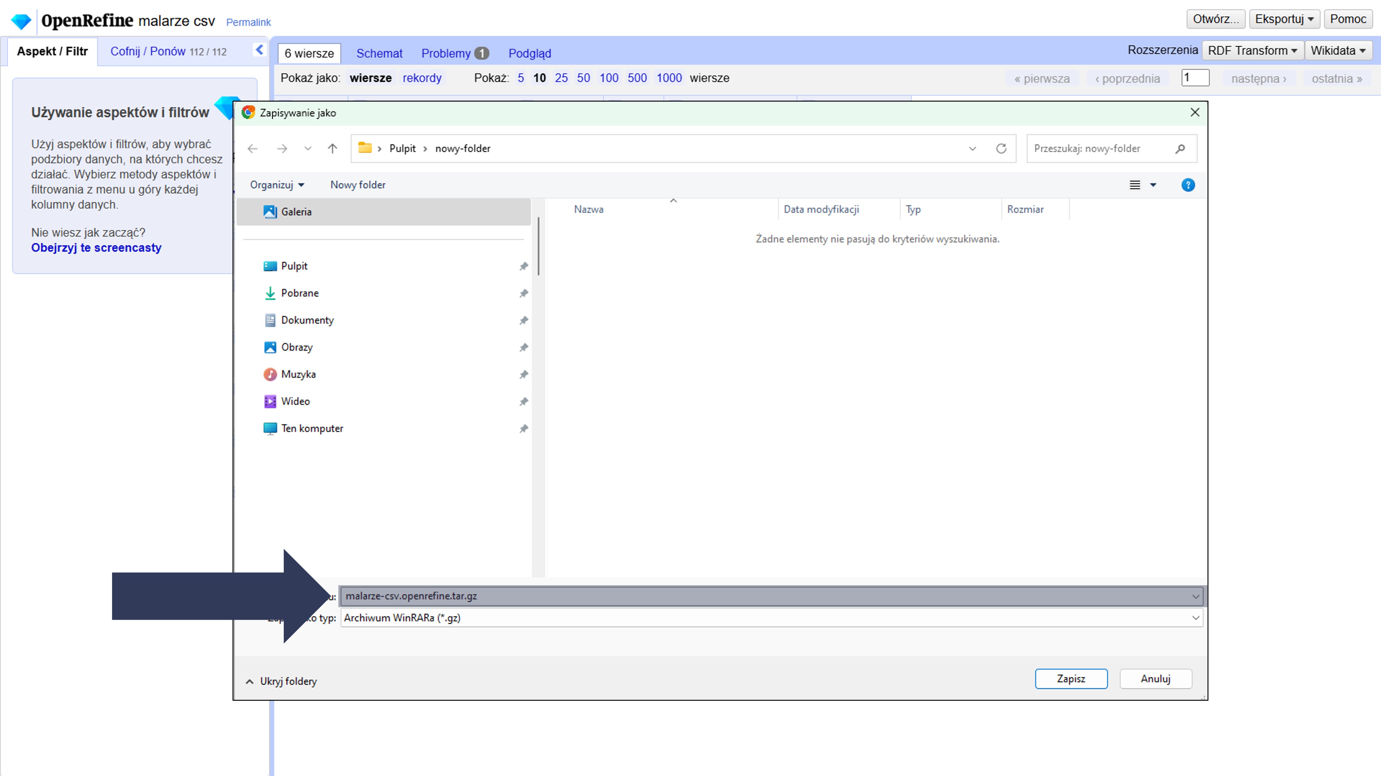 Aby wyeksportować archiwum projektu OpenRefine do pliku .tar.gz: