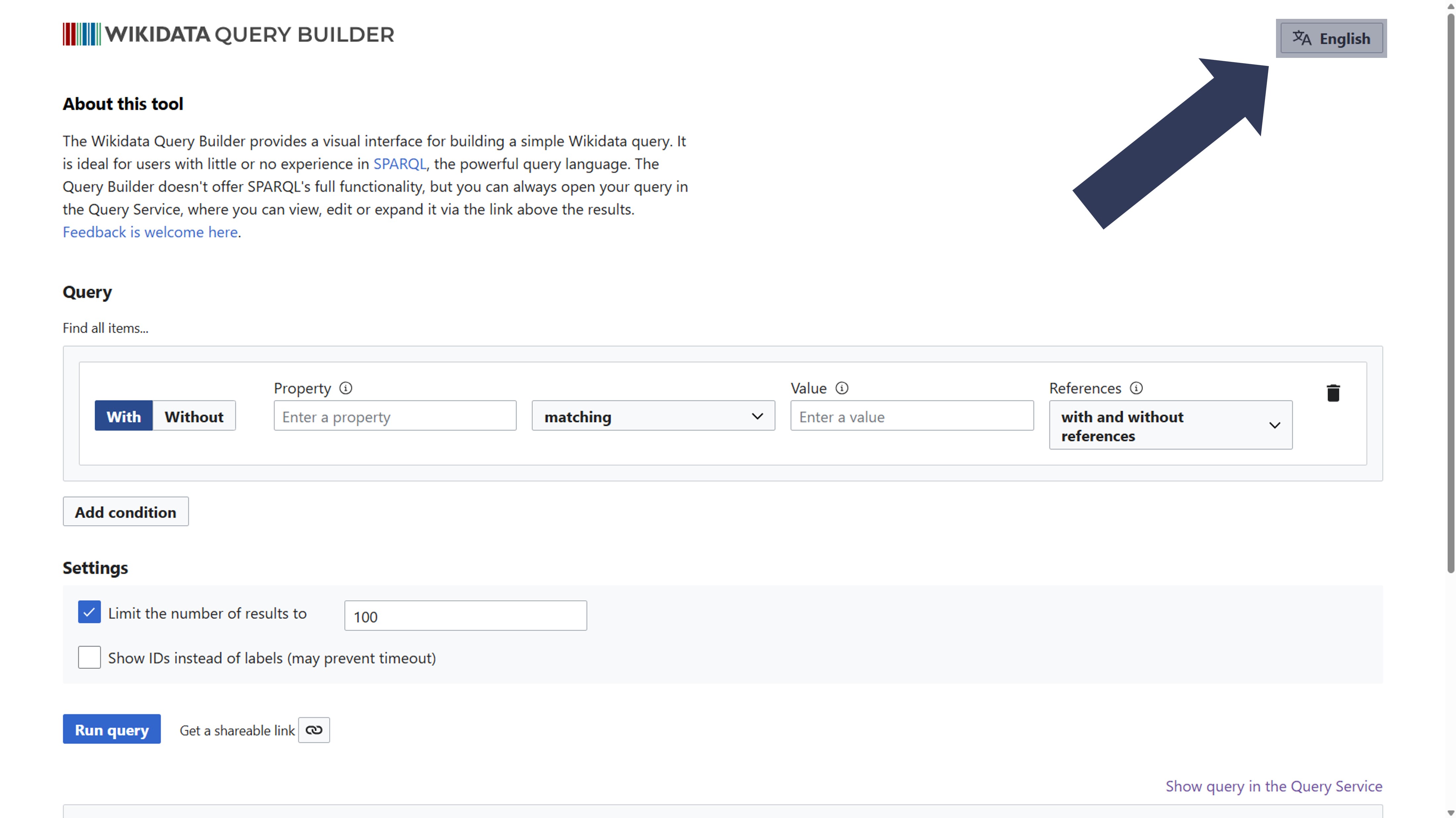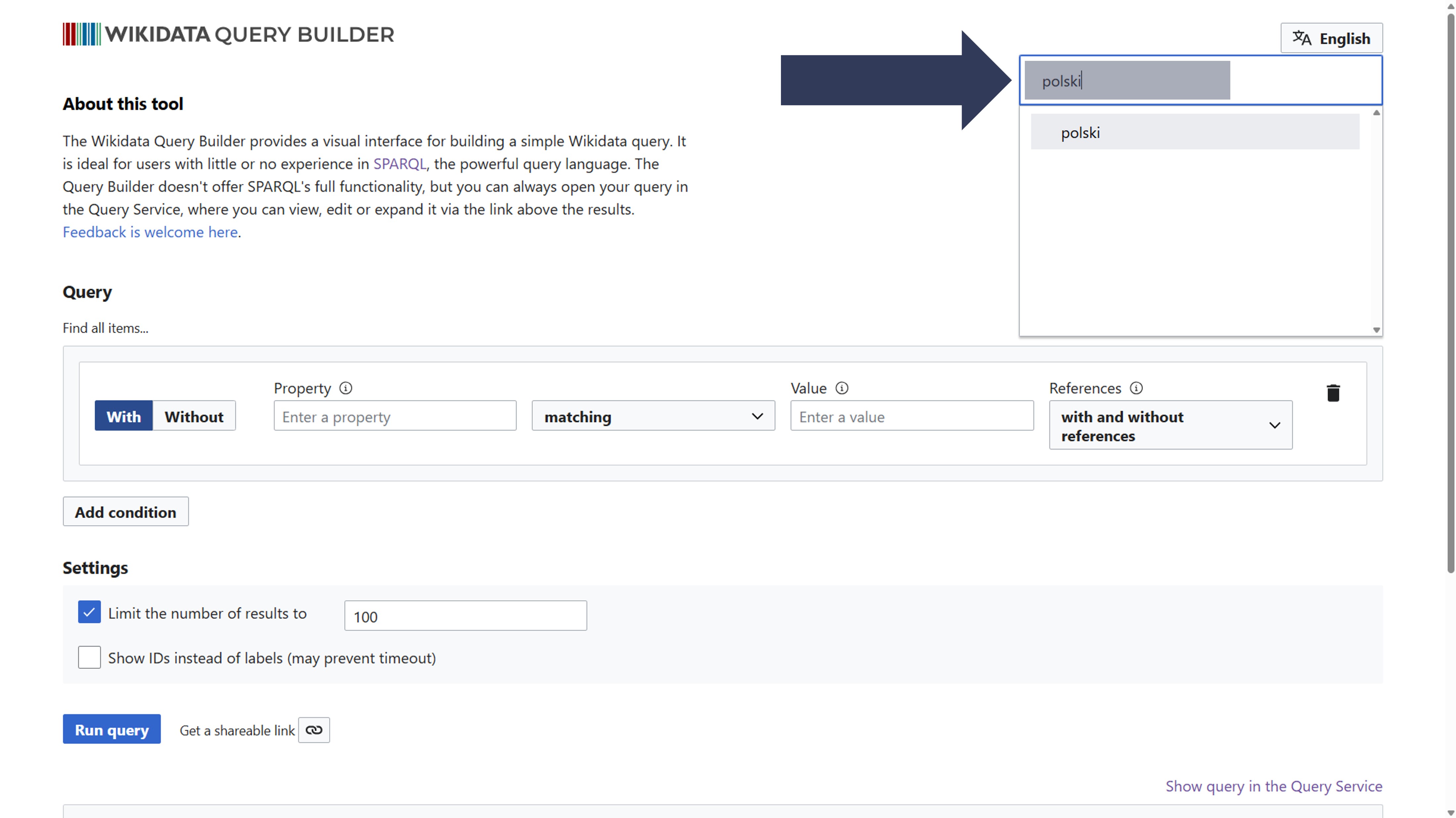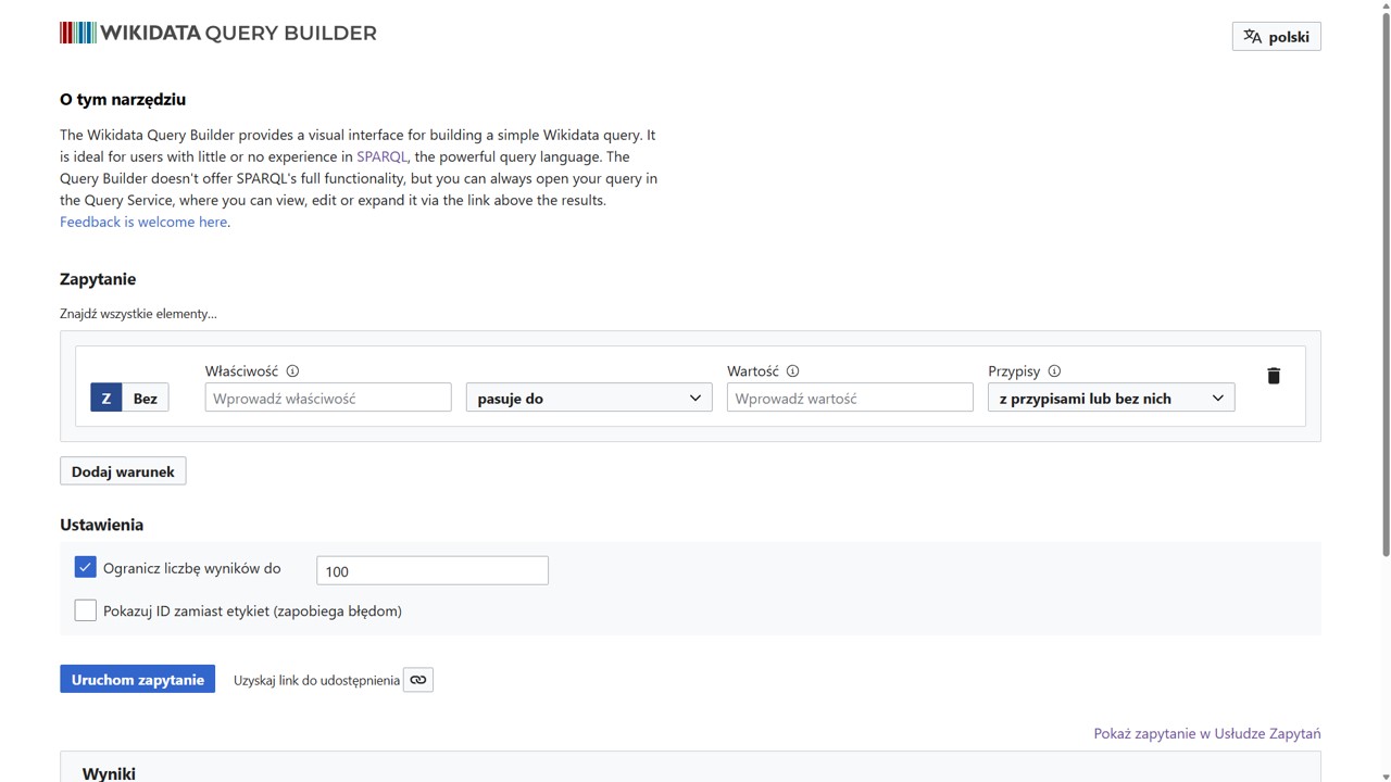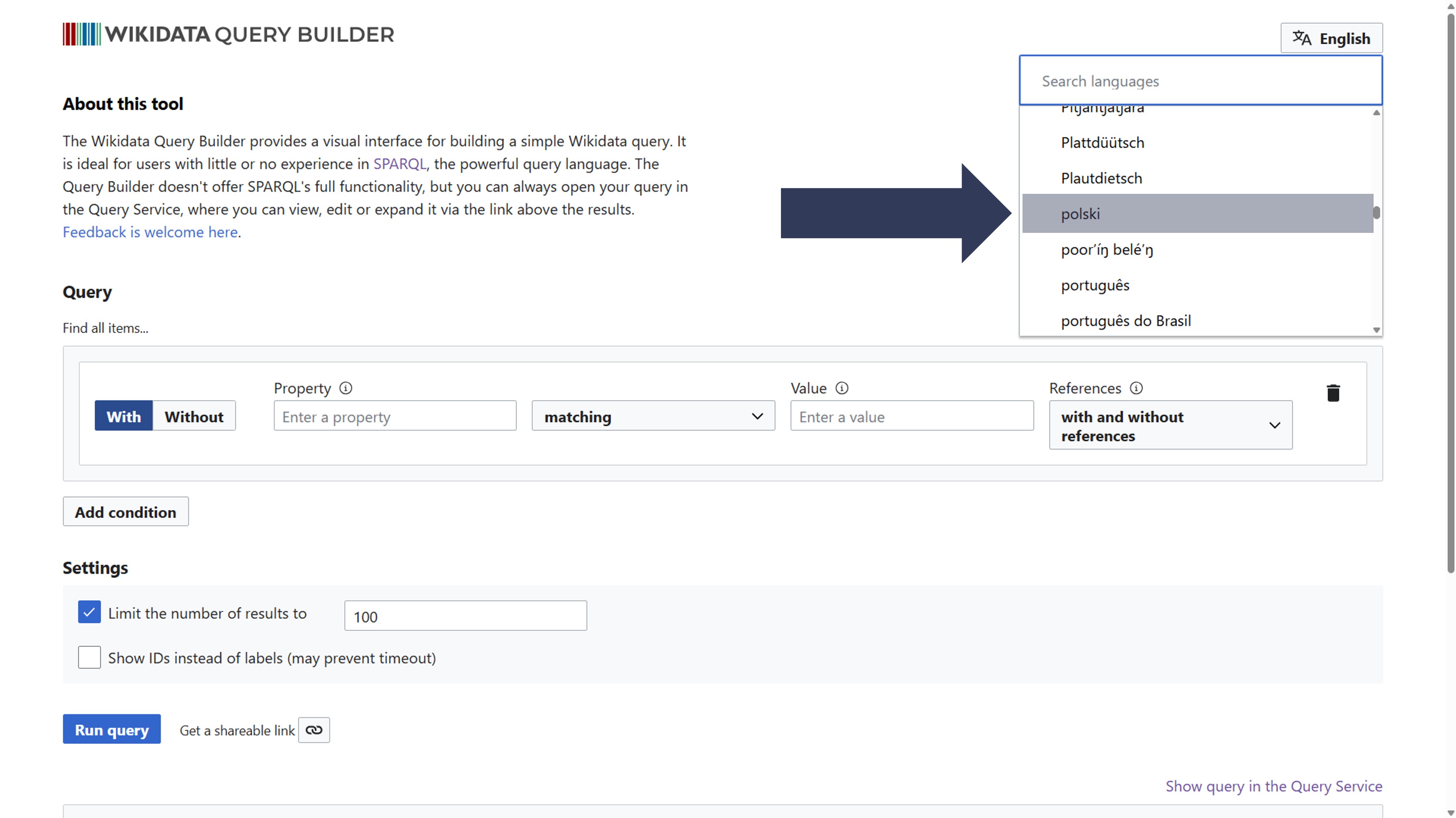 6.2.2 Wybór języka interfejsu WikiData Query Builder