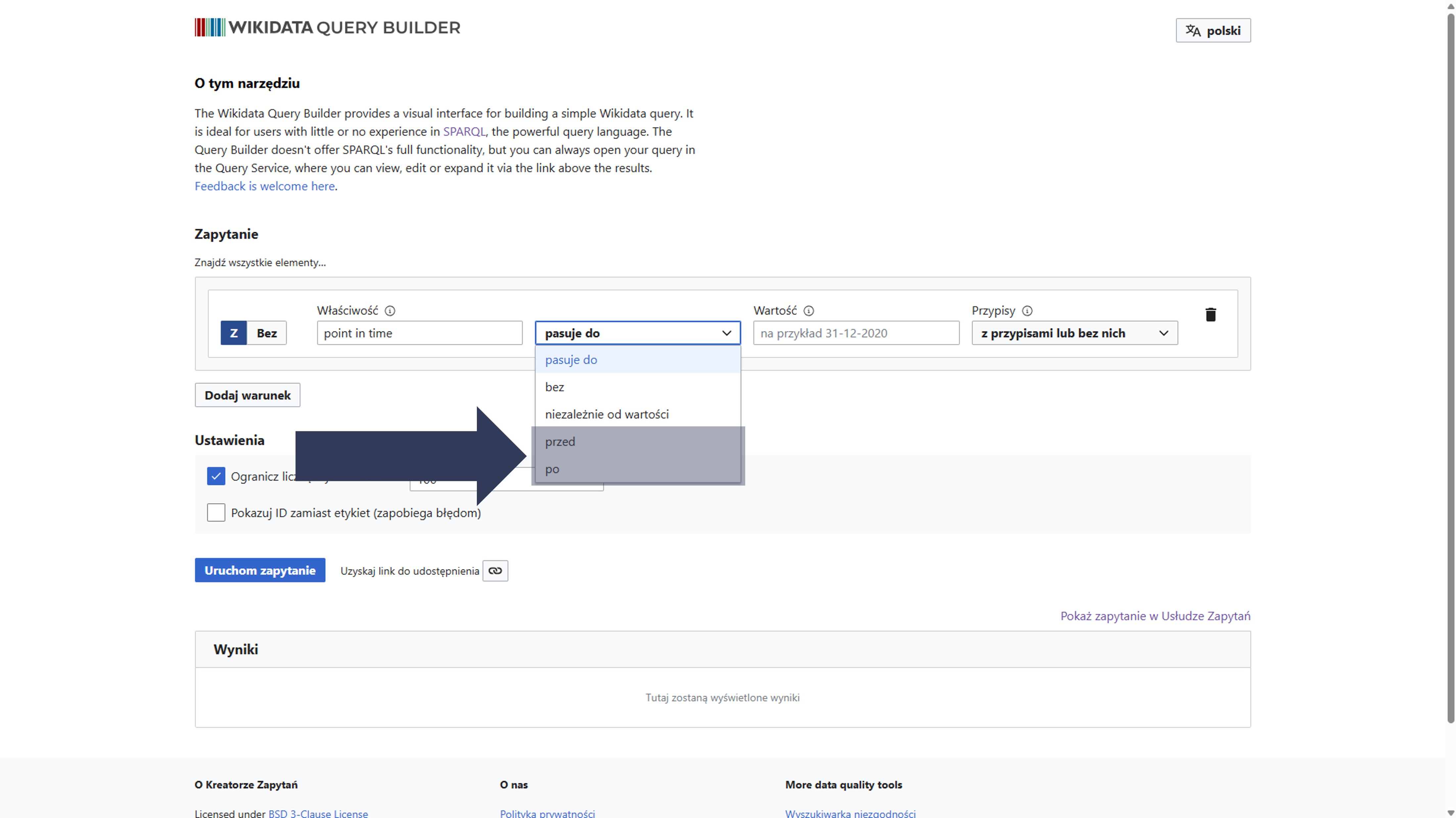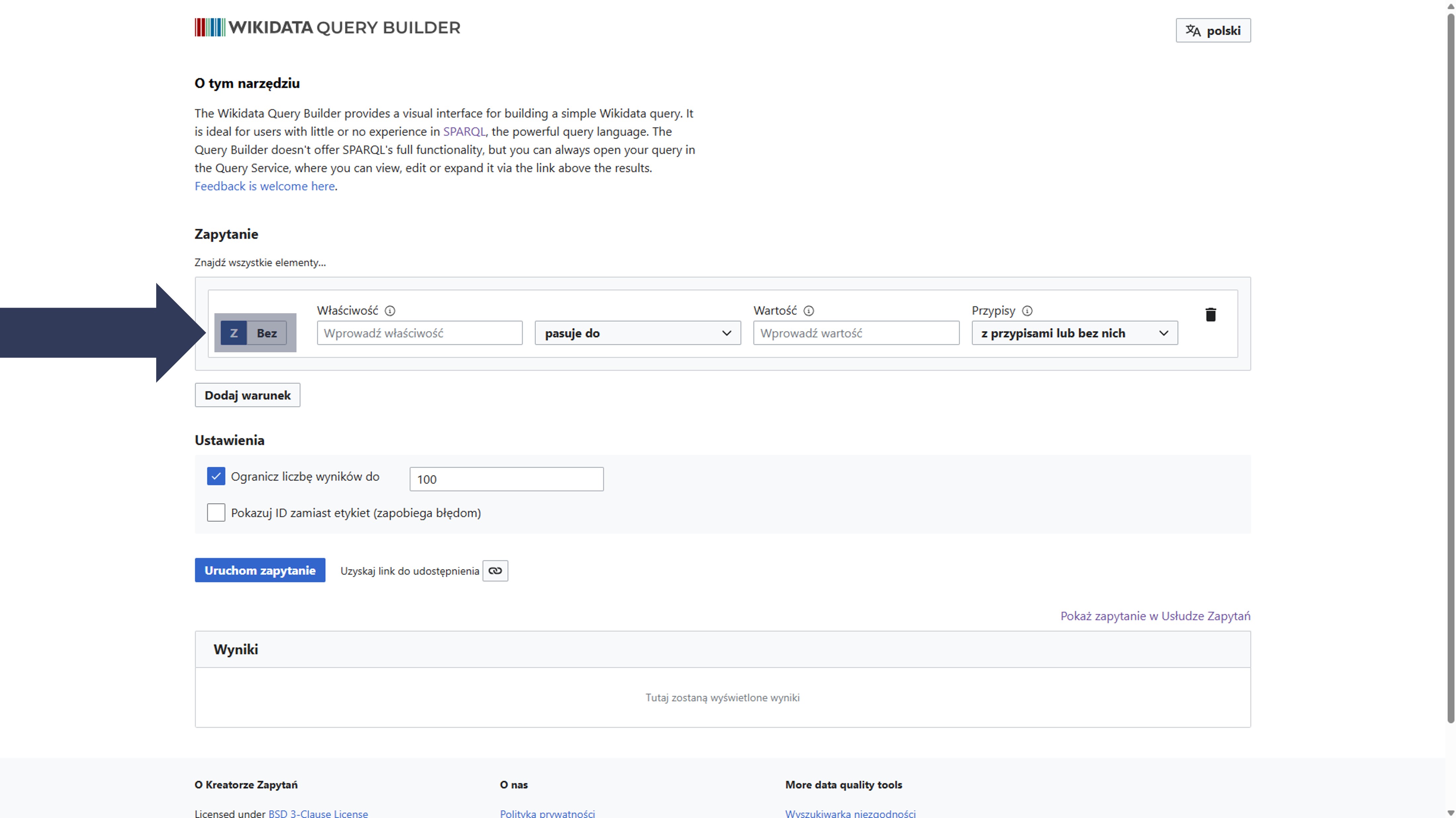 - Wybierz Bez – aby kwerenda wykluczała elementy spełniające definiowany warunek.