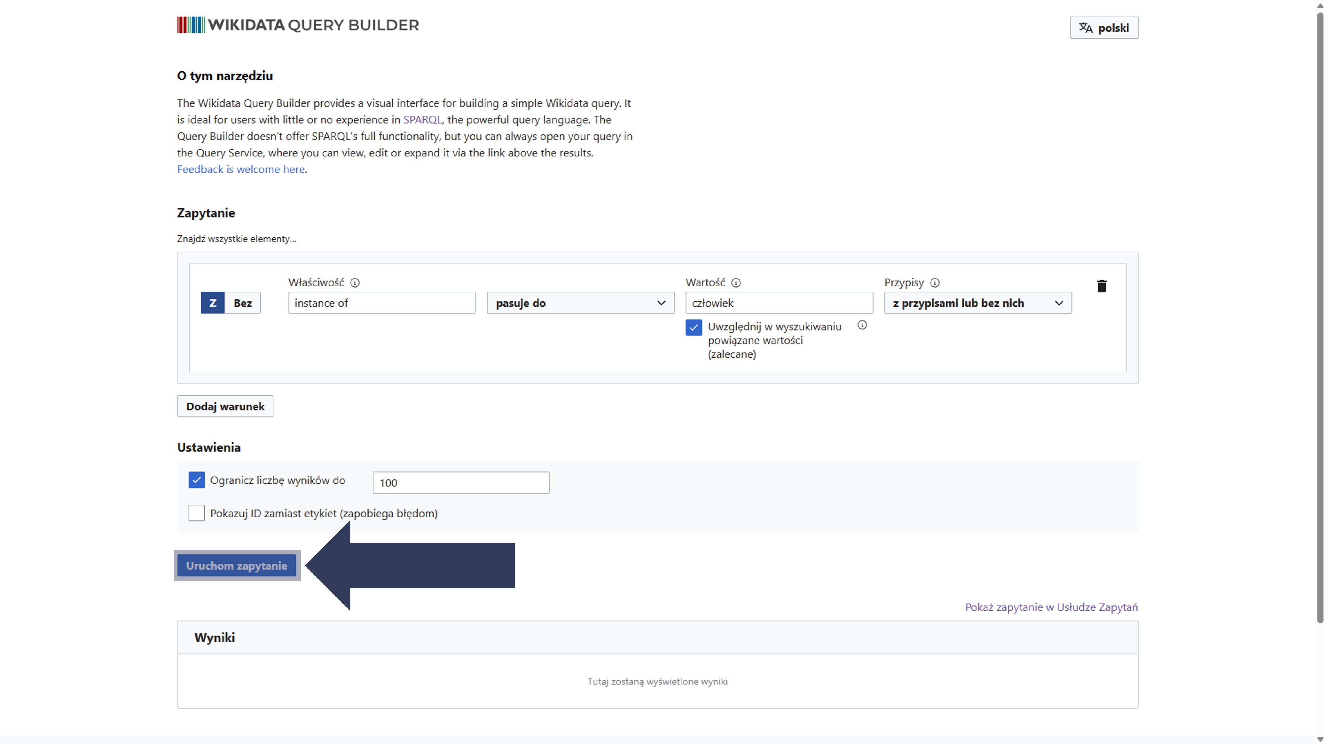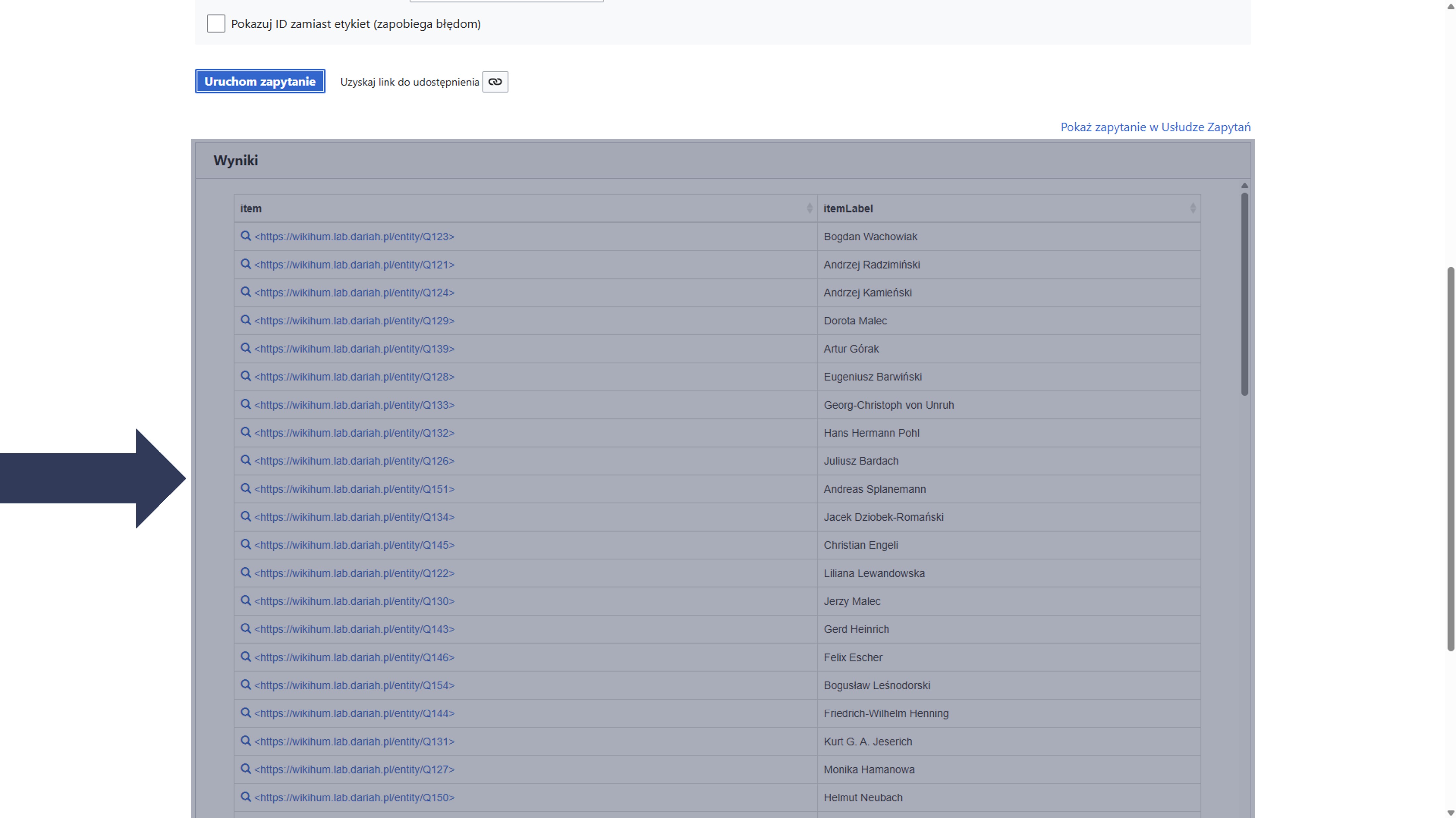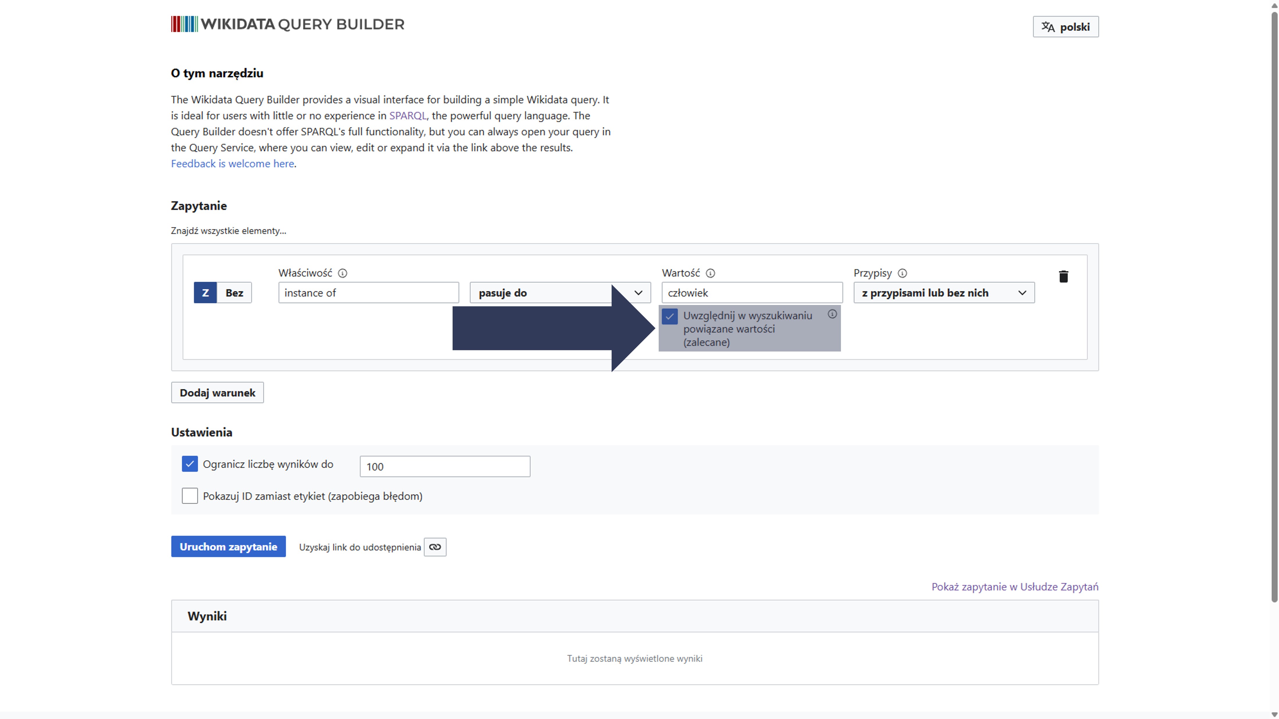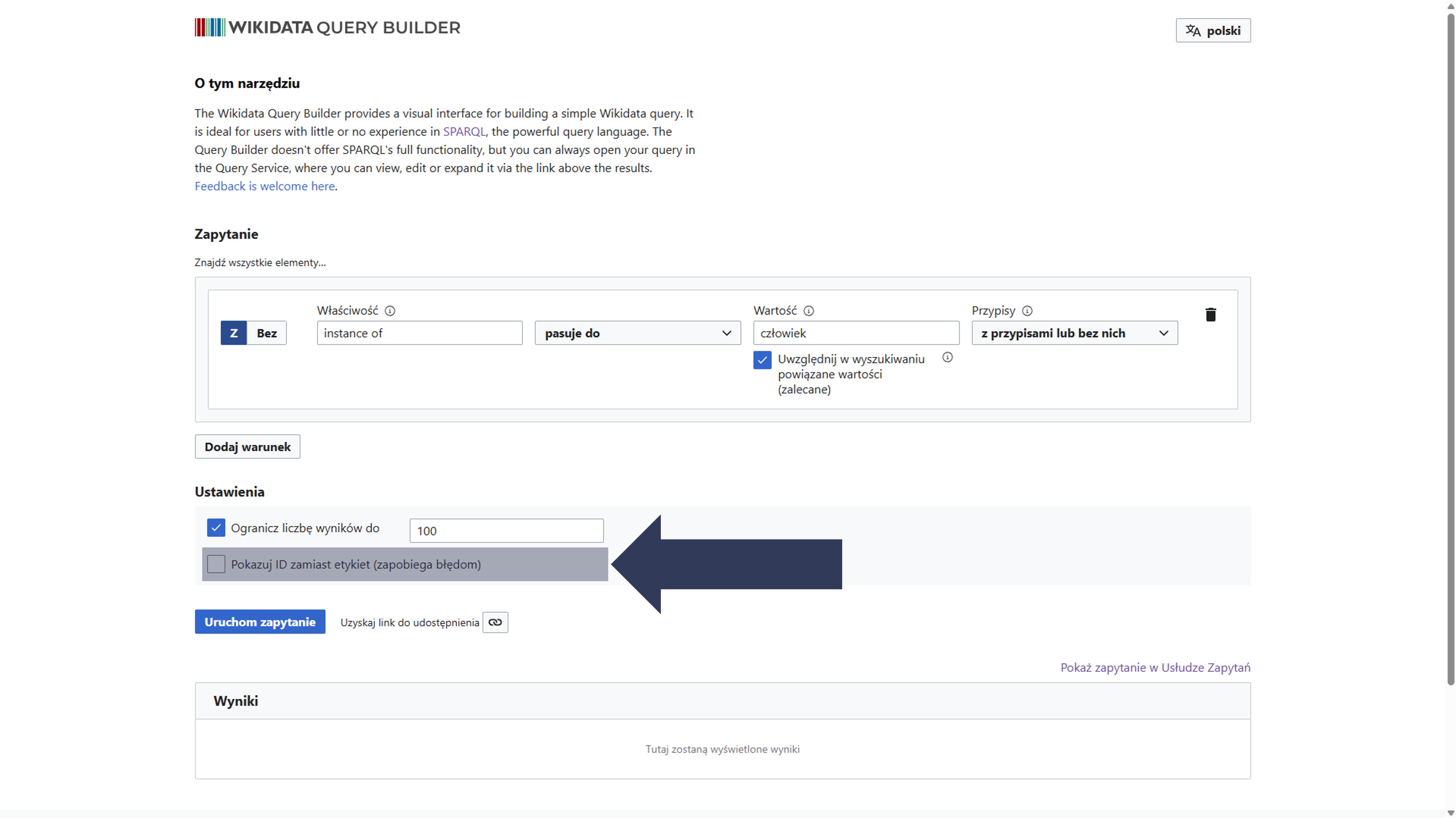 - Opcjonalnie: Zaznacz pole Pokazuj ID zamiast etykiet, aby w wynikach wyświetlały się identyfikatory (np.