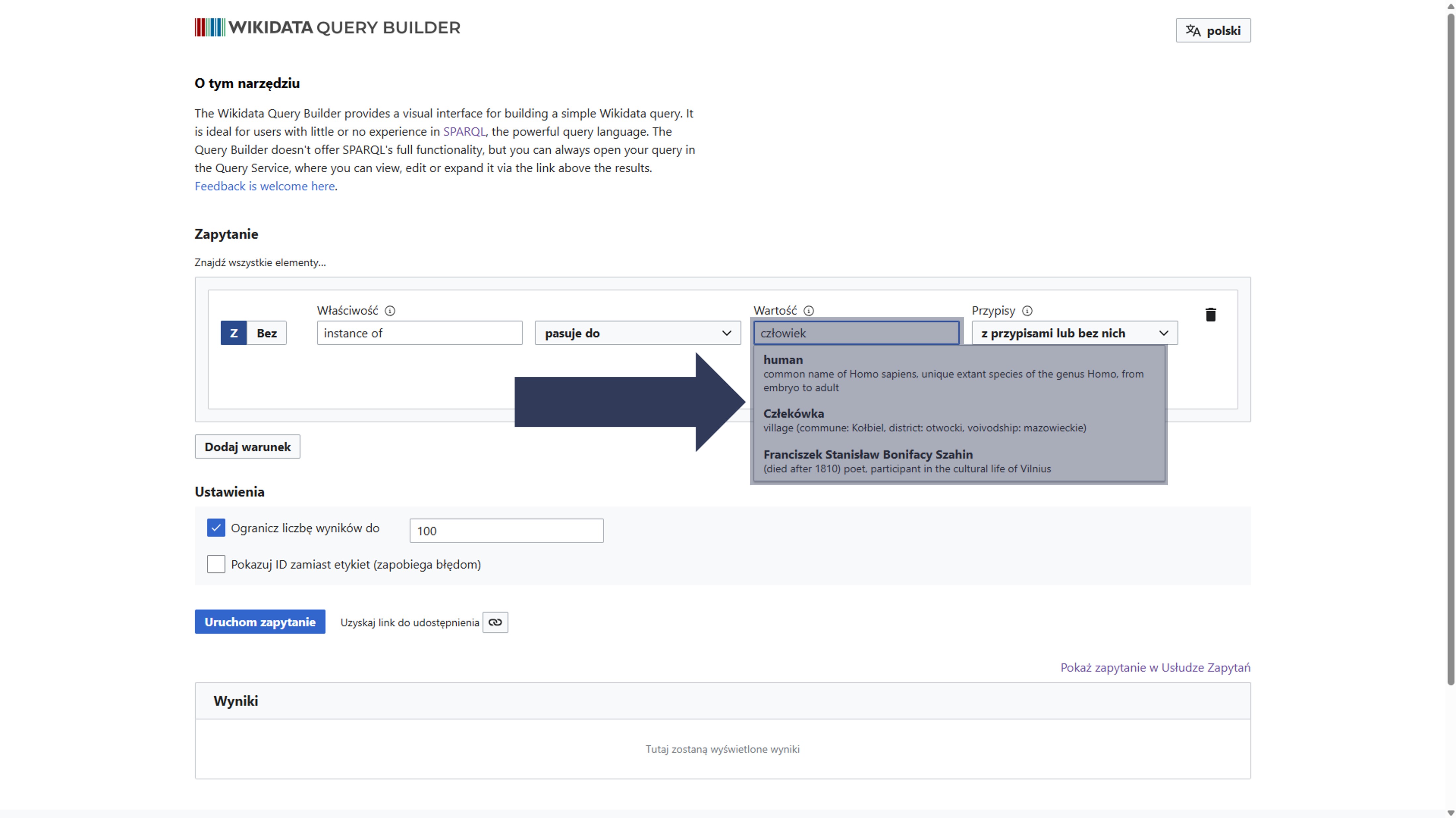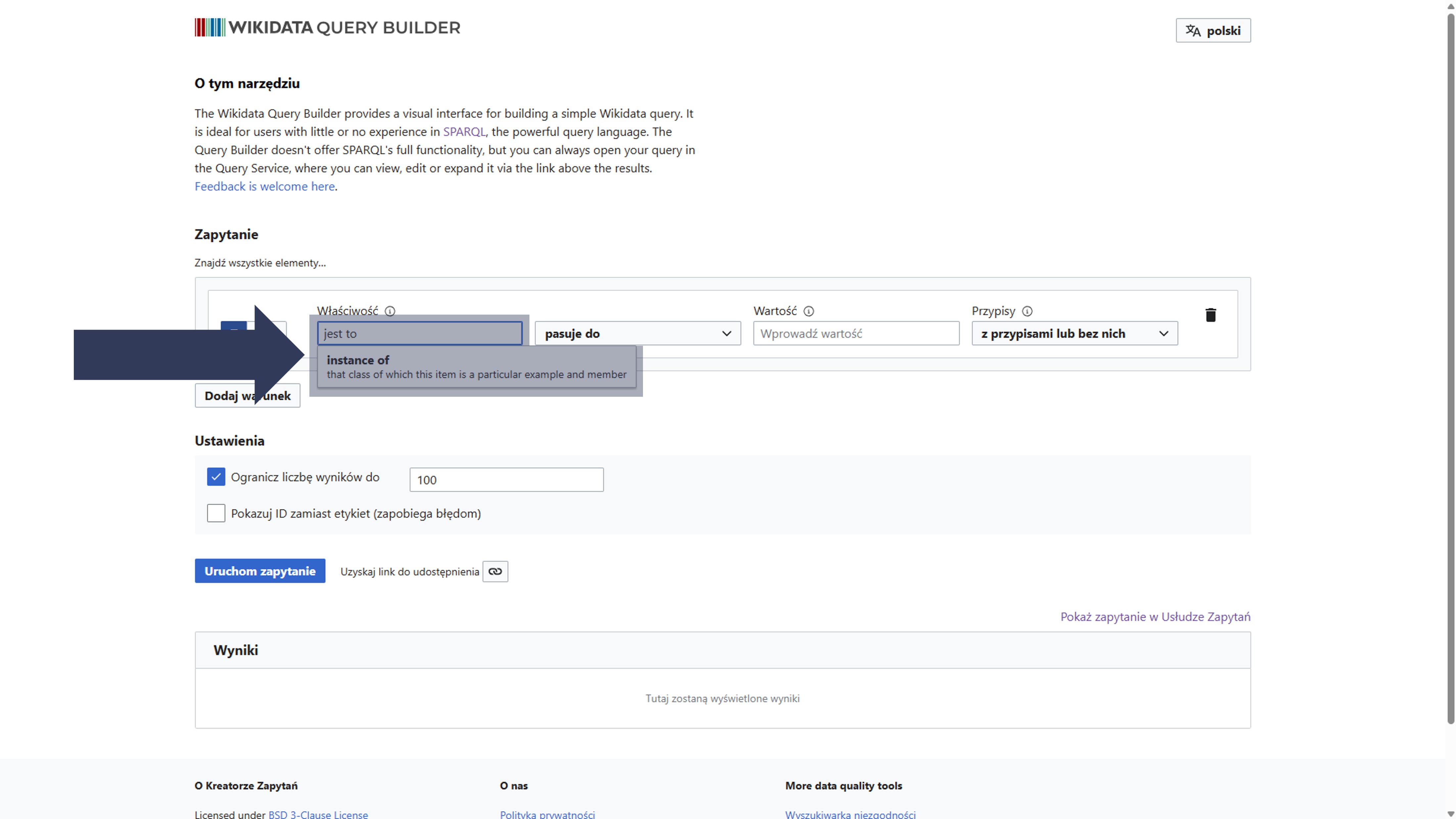 P27) lub aliasu. Podczas wpisywania pojawi się lista podpowiedzi – wybierz z niej odpowiednią właściwość.