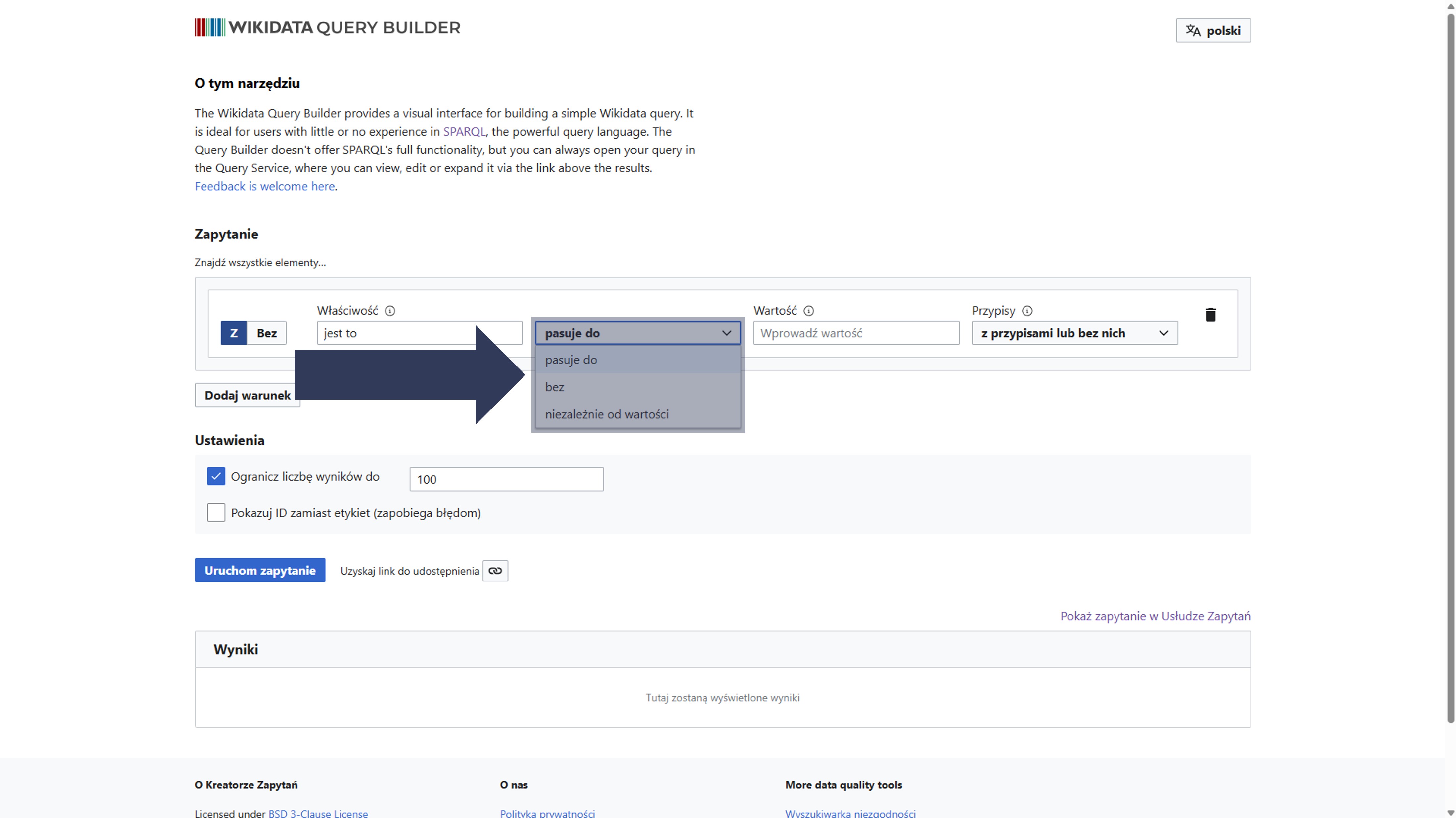 - W menu rozwijanym pasuje do wybierz operator warunku. Domyślnie ustawiony jest operator pasuje do – oznacza, że wynik kwerendy musi dokładnie odpowiadać wskazanej wartości. Dostępne są również: