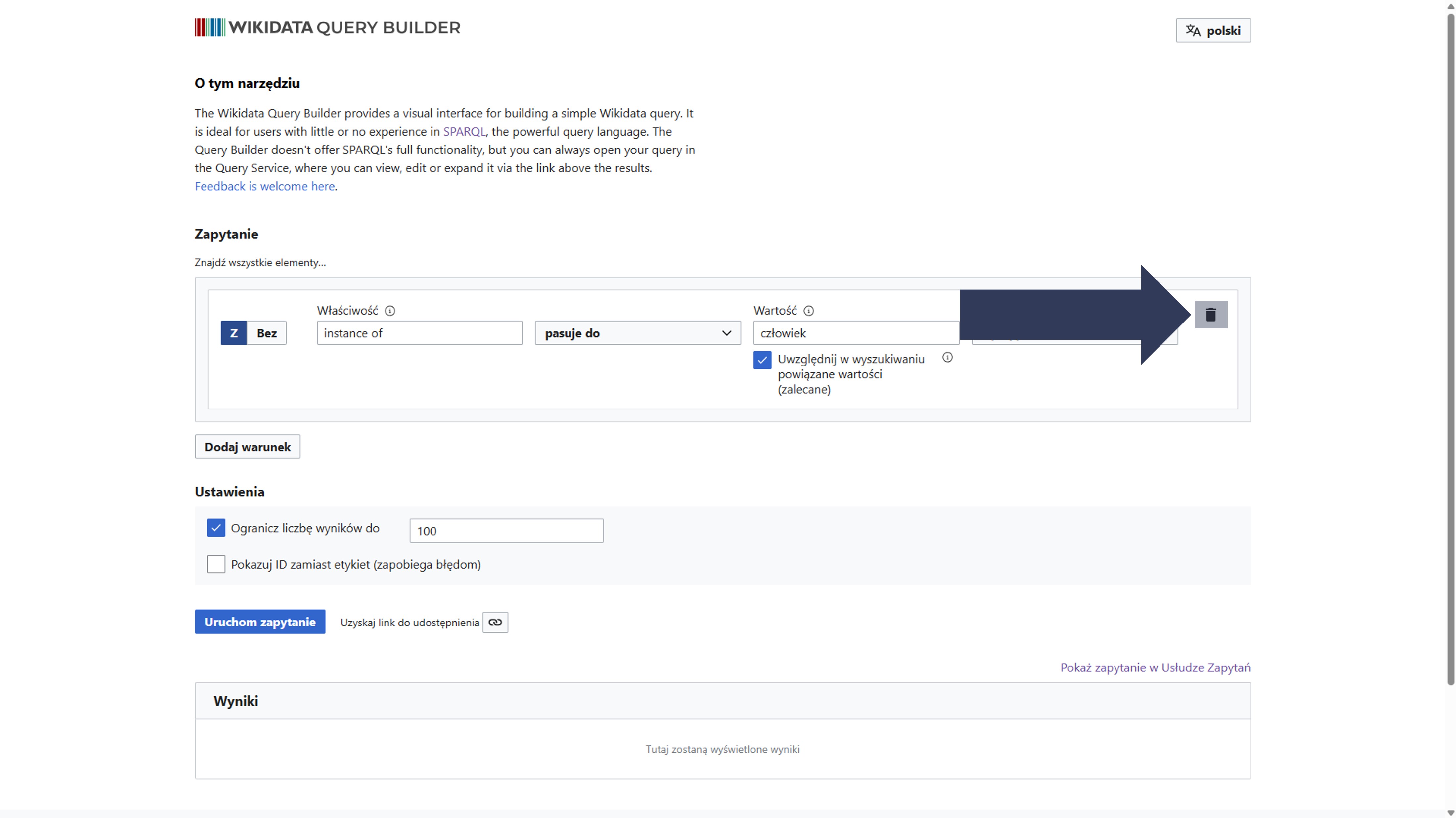 - Opcjonalnie: Kliknij ikonę kosza, aby usunąć warunek.