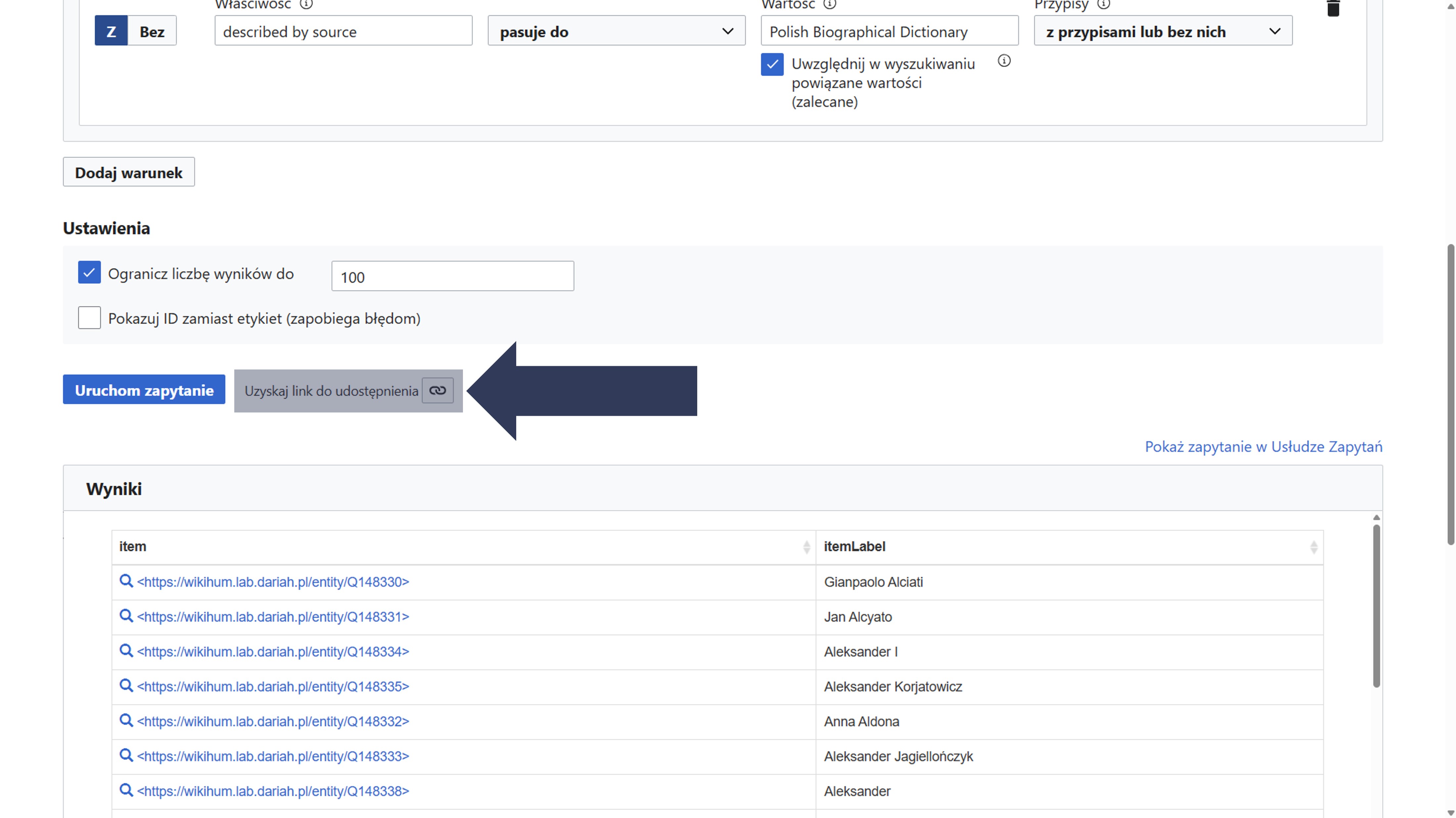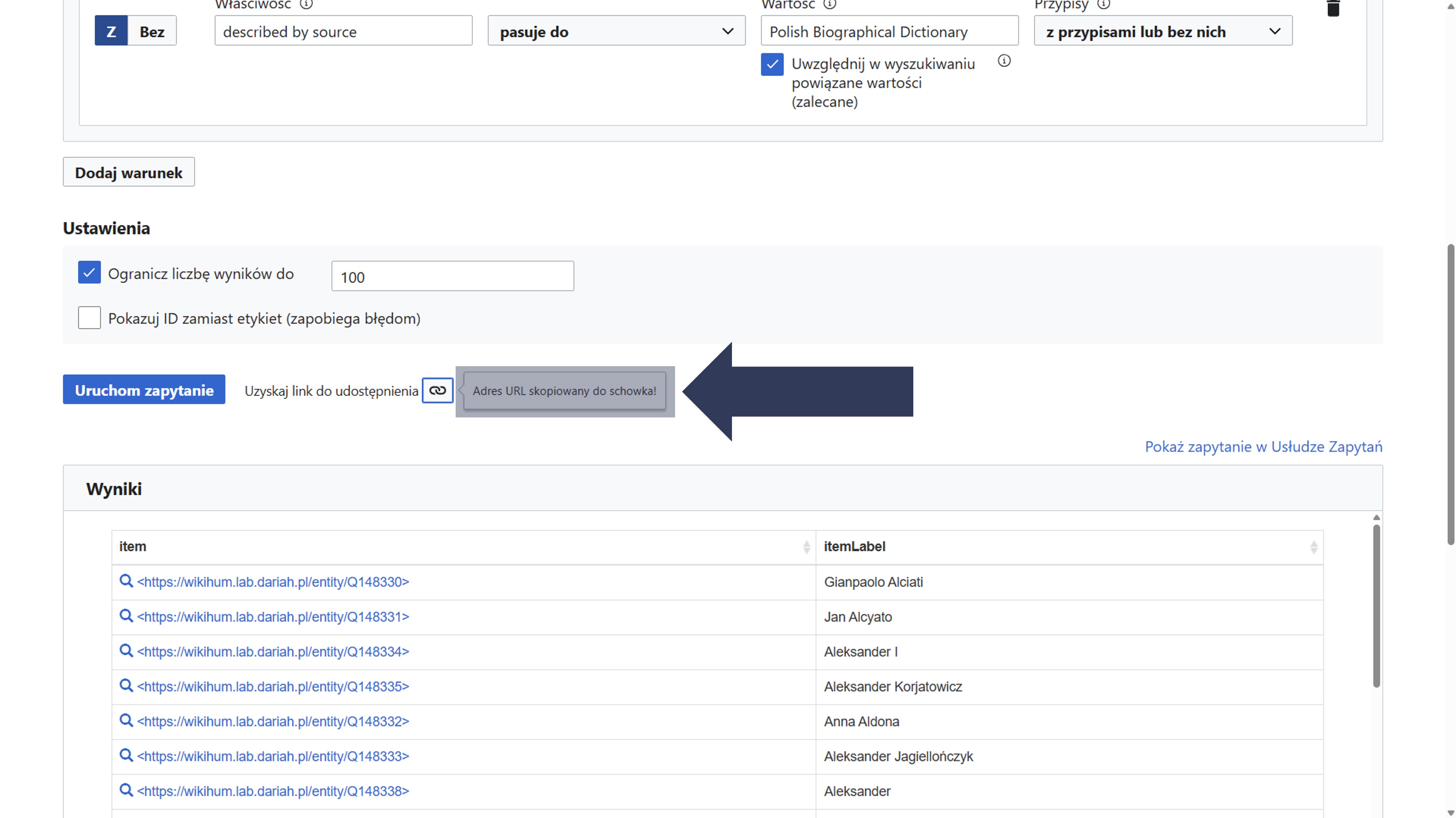 Skopiowany link zawiera wszystkie parametry bieżącej kwerendy i umożliwia jej ponowne uruchomienie lub udostępnienie innym użytkownikom.