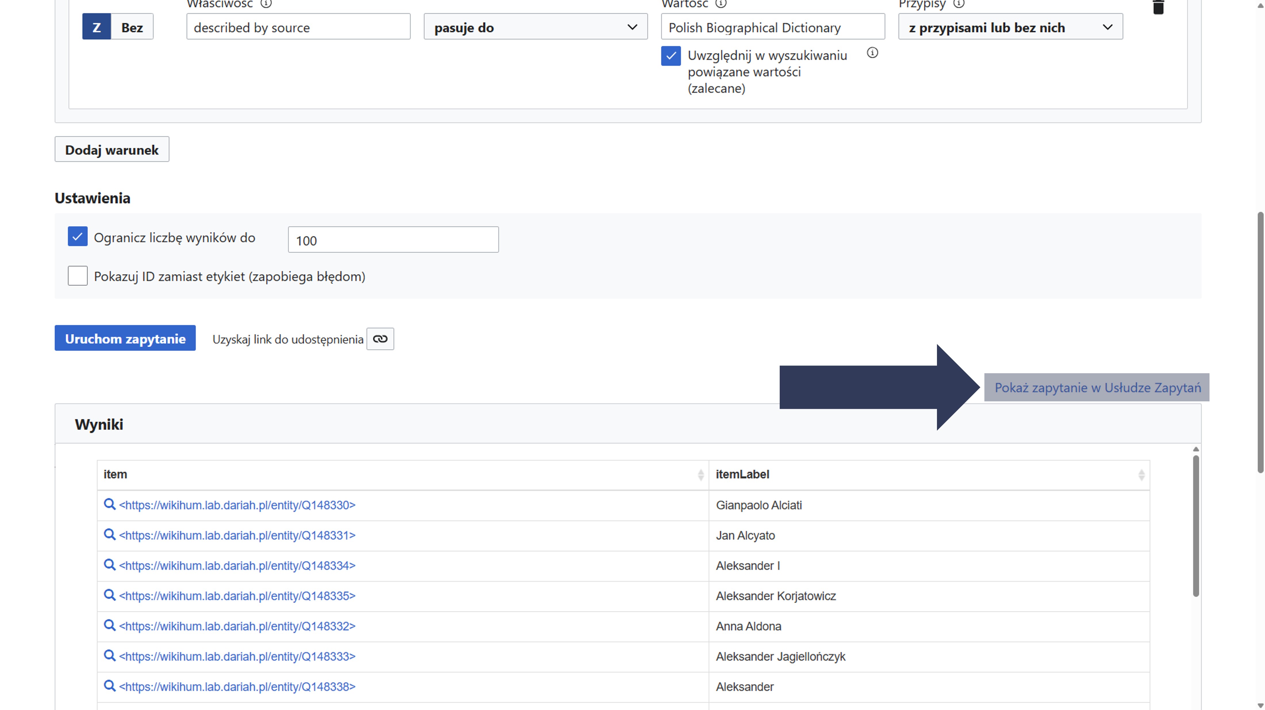 Edycja bieżącego zapytania jest możliwa również w narzędziu WikiData Query Service (opisanym w sekcji nr 7).
