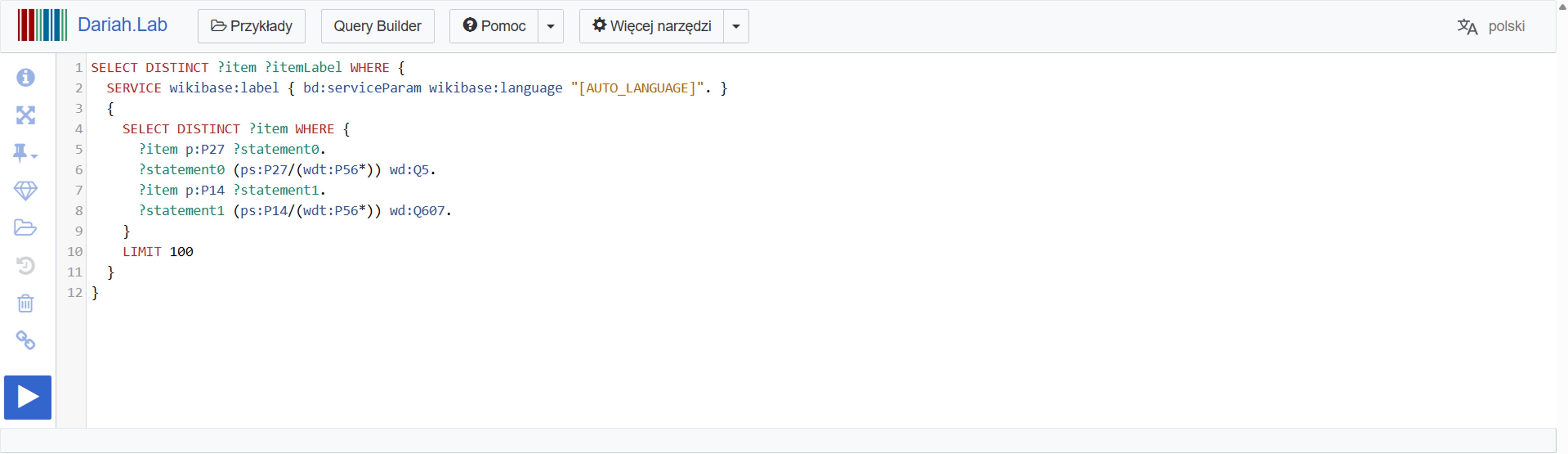 Narzędzie WikiData Query Service wraz z bieżącą kwerendą w języku SPARQL otworzy się w nowym oknie przeglądarki.