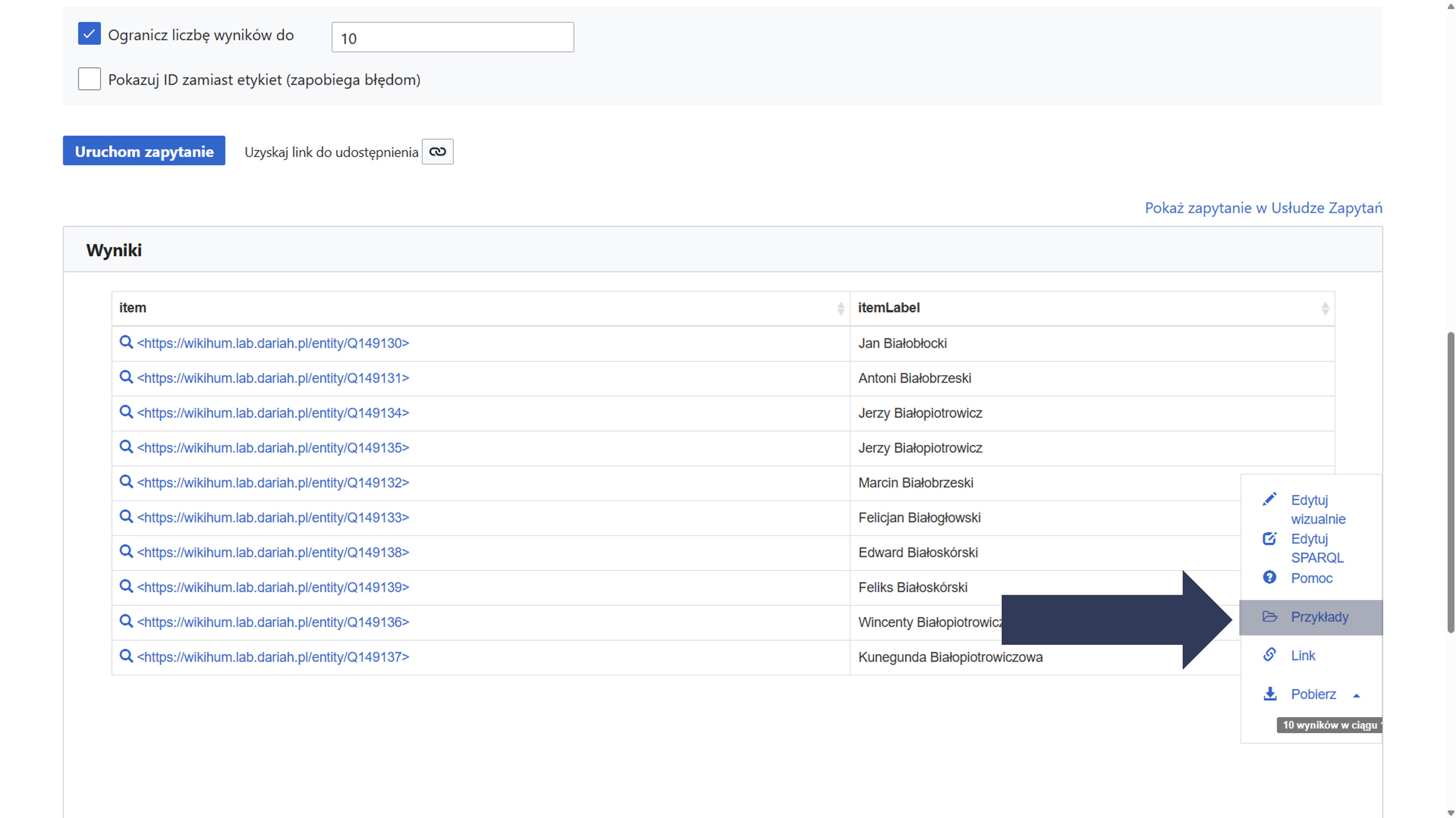 Warto skorzystać również z gotowych zapytań. Zespół Pracowni Historii Cyfrowej Instytutu Historii im. Tadeusza Manteuffla Polskiej Akademii Nauk przygotował 25 przykładowych zapytań w języku SPARQL.
