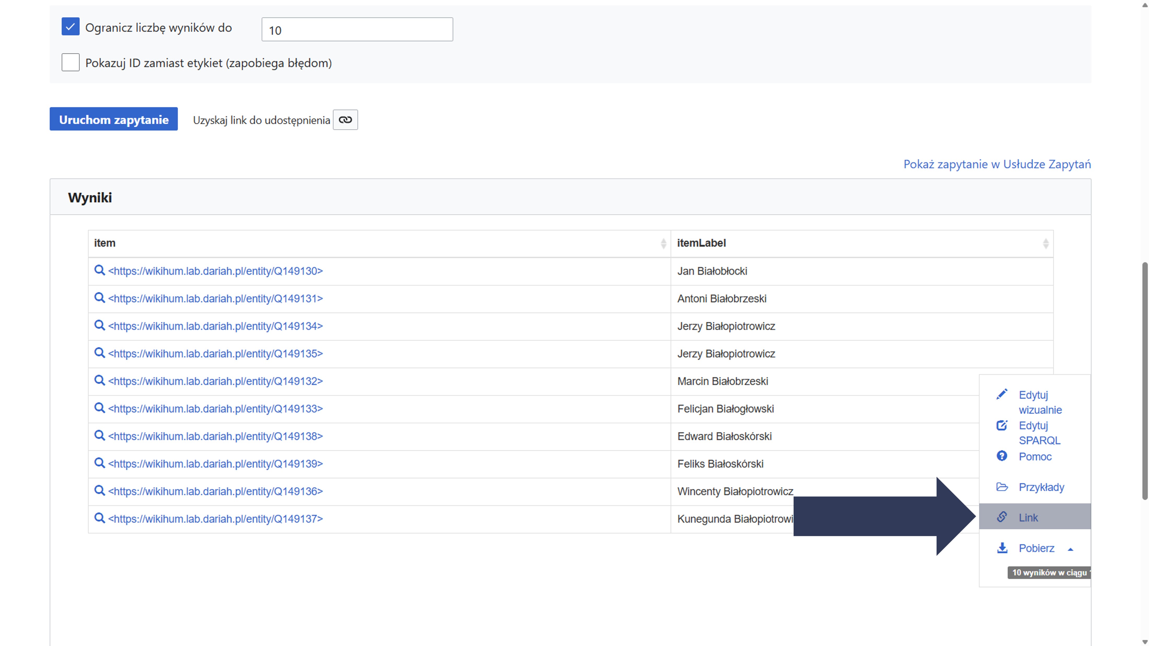 - W menu po prawej stronie okna wyników kliknij przycisk Link.