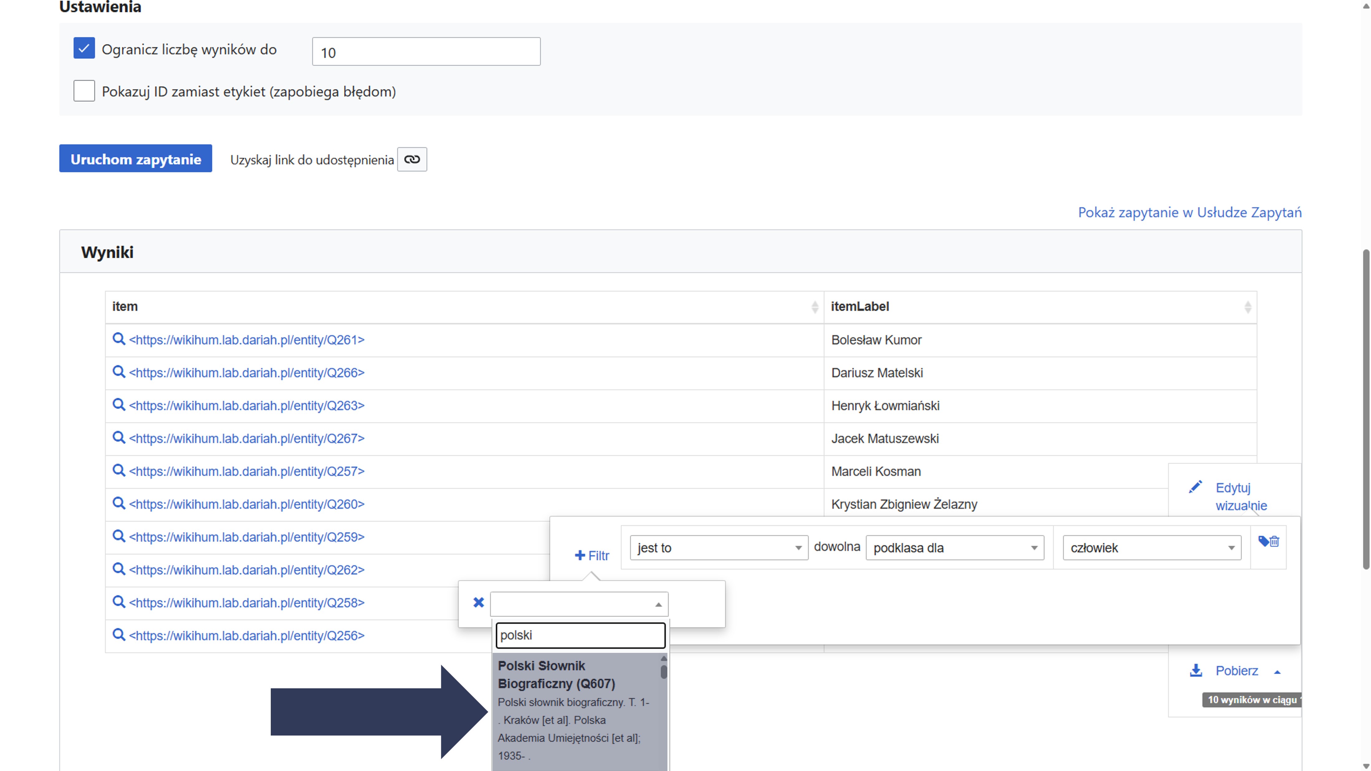- W wyświetlonym polu wpisz nazwę (np. Polski Słownik Biograficzny) lub identyfikator (np. Q607) żądanej wartości.