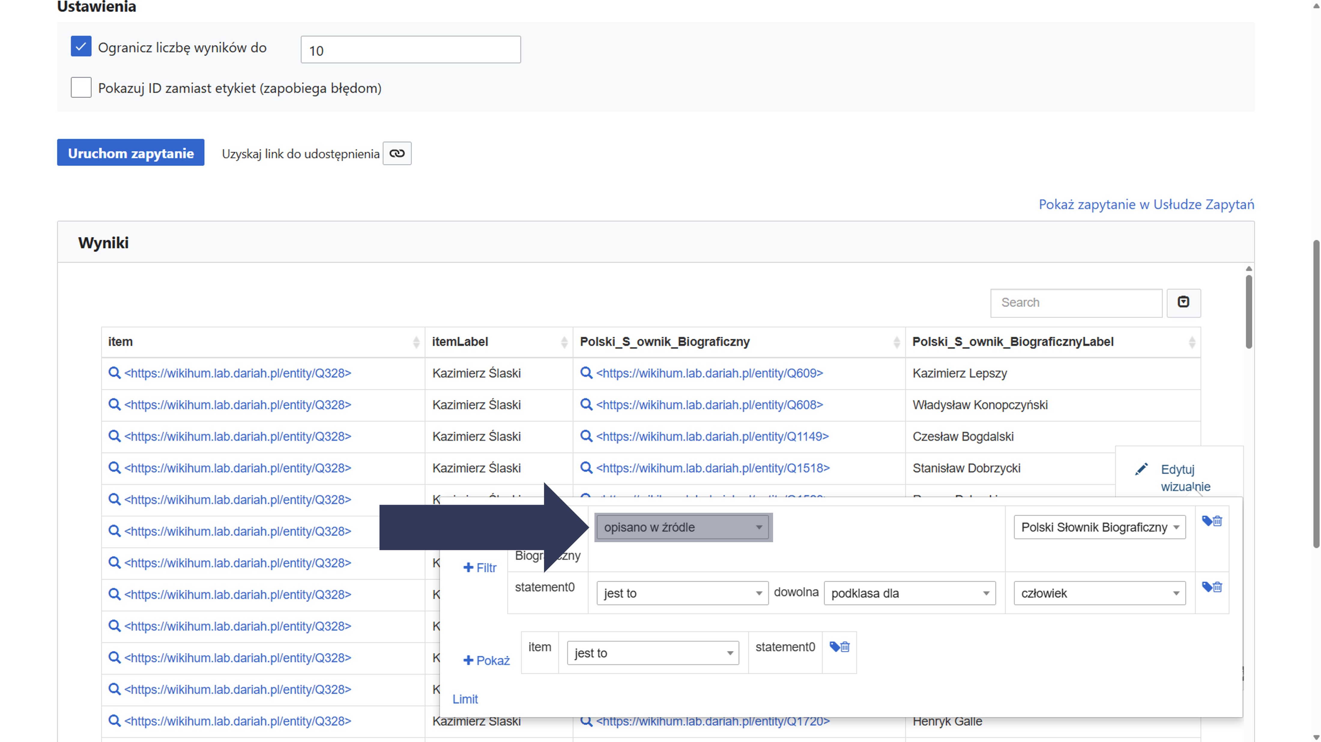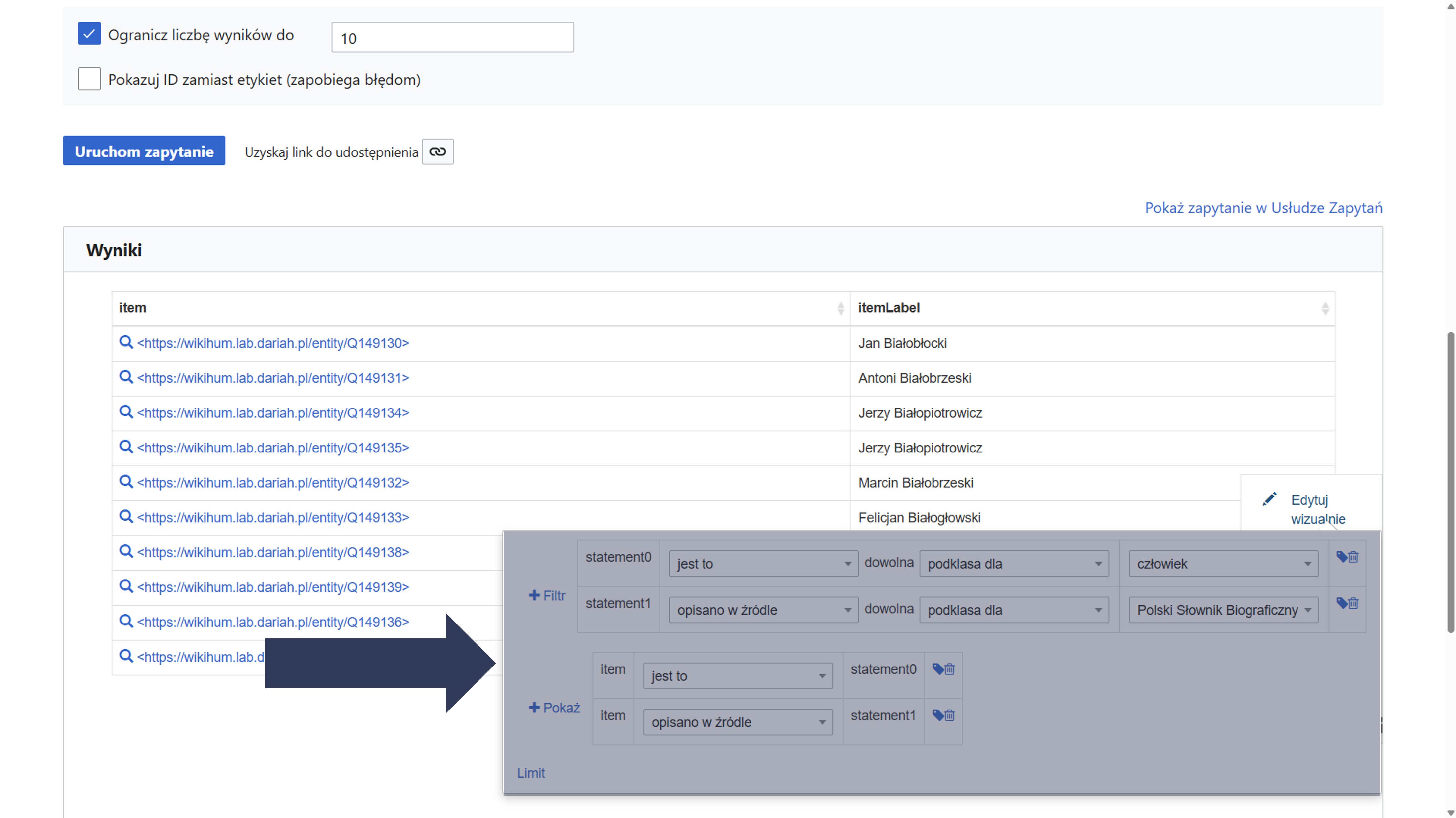 Uwaga: edycja wizualna wyników zapytania oznacza zmianę warunków zapytania.