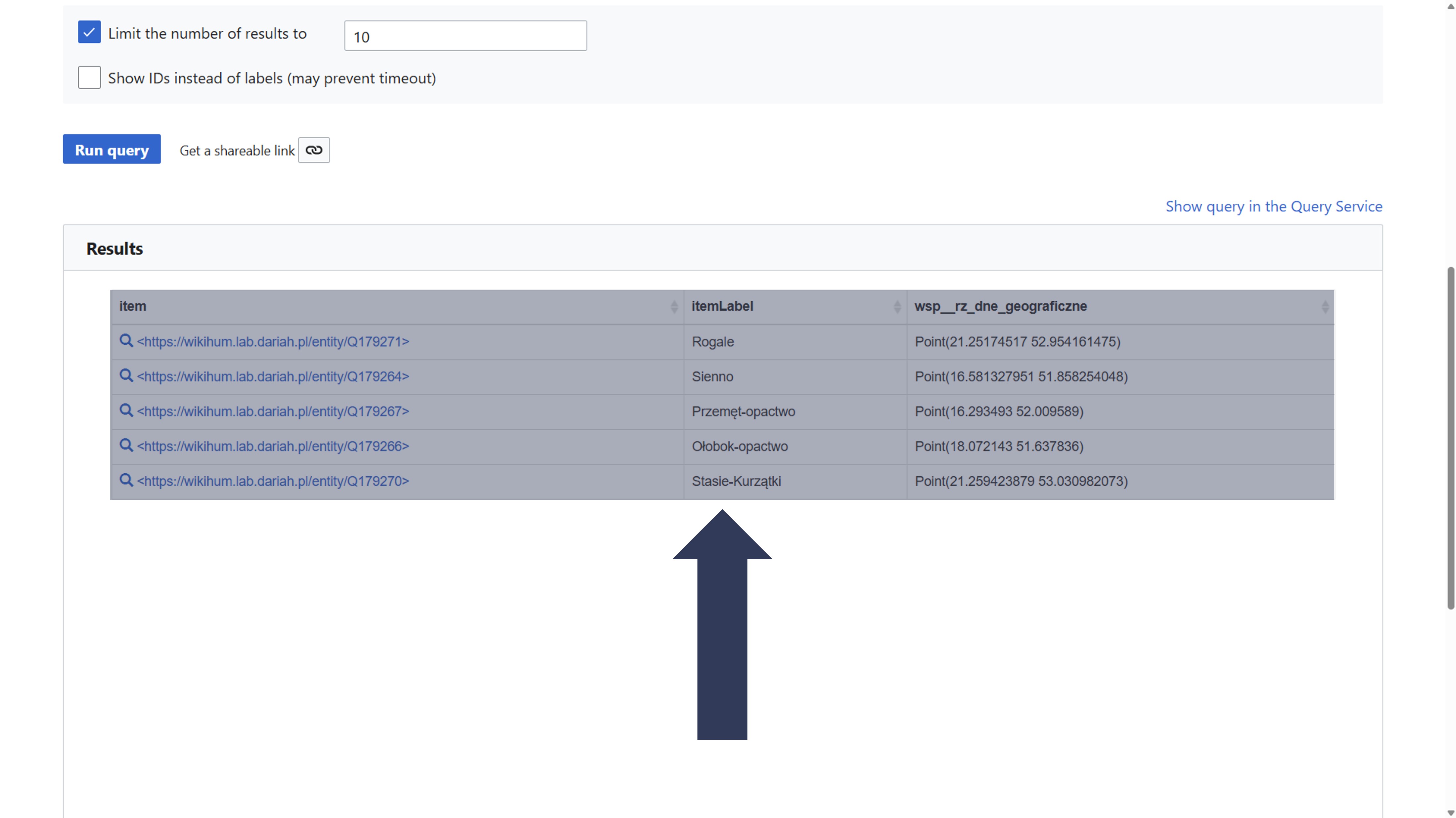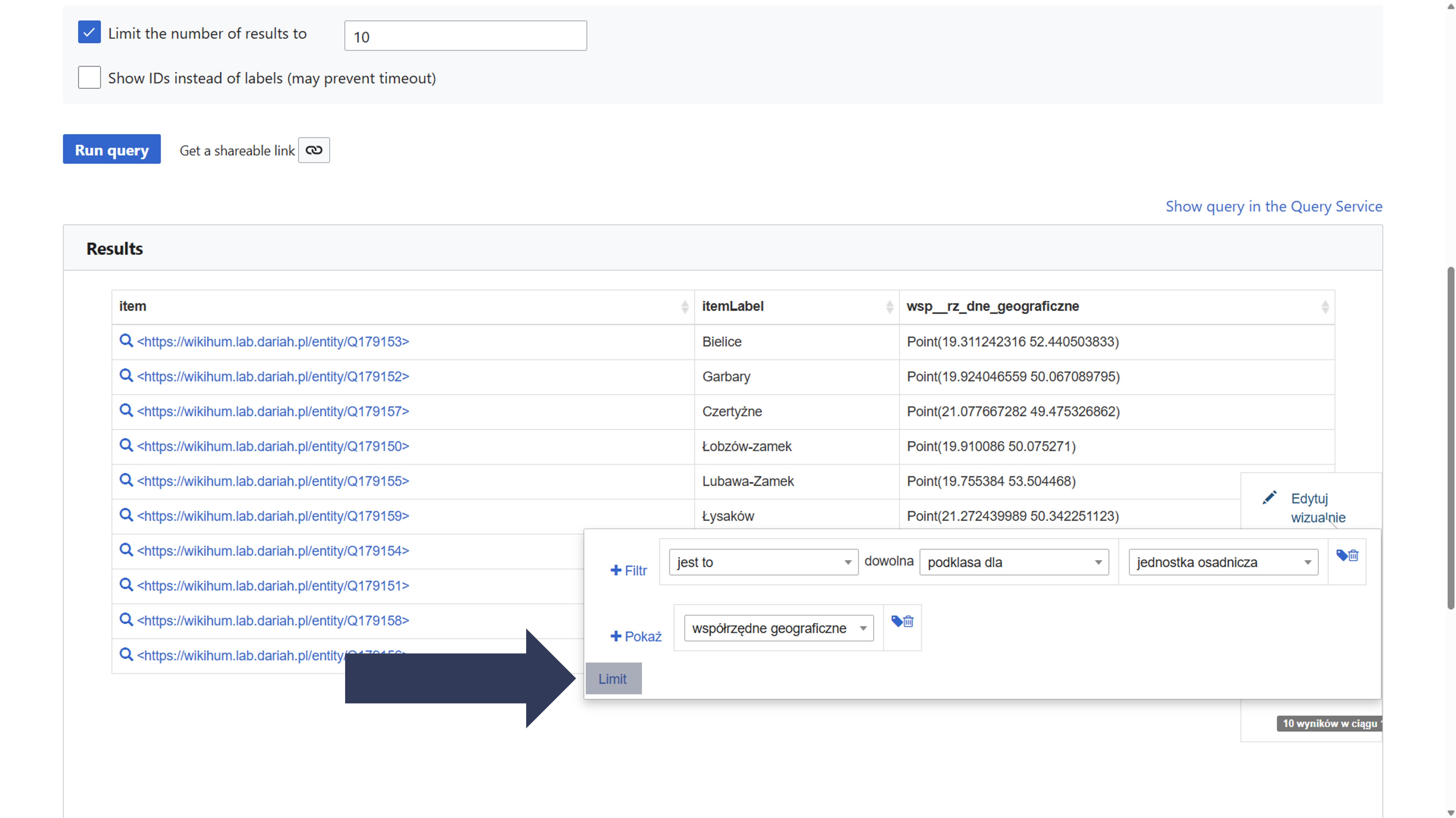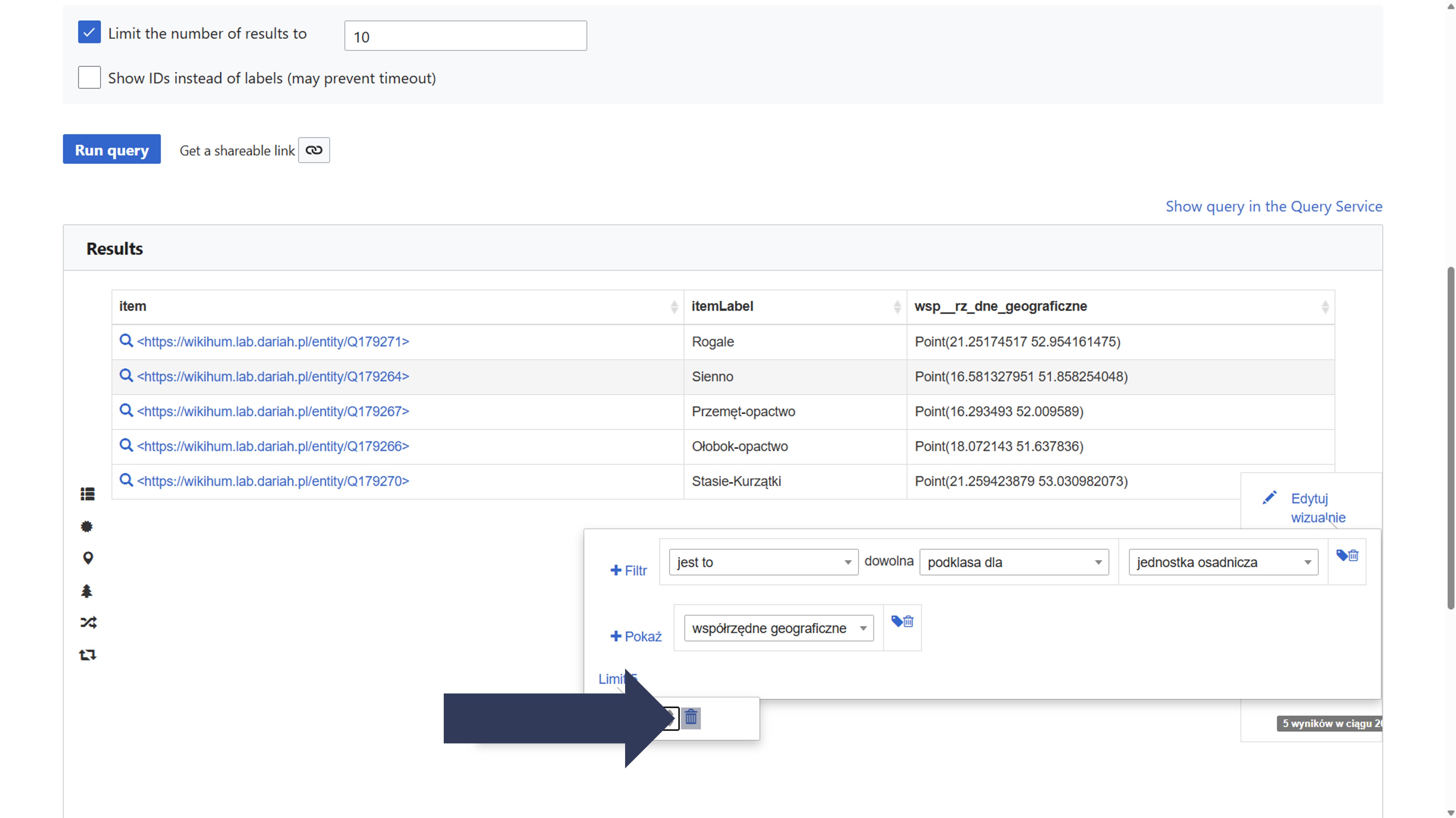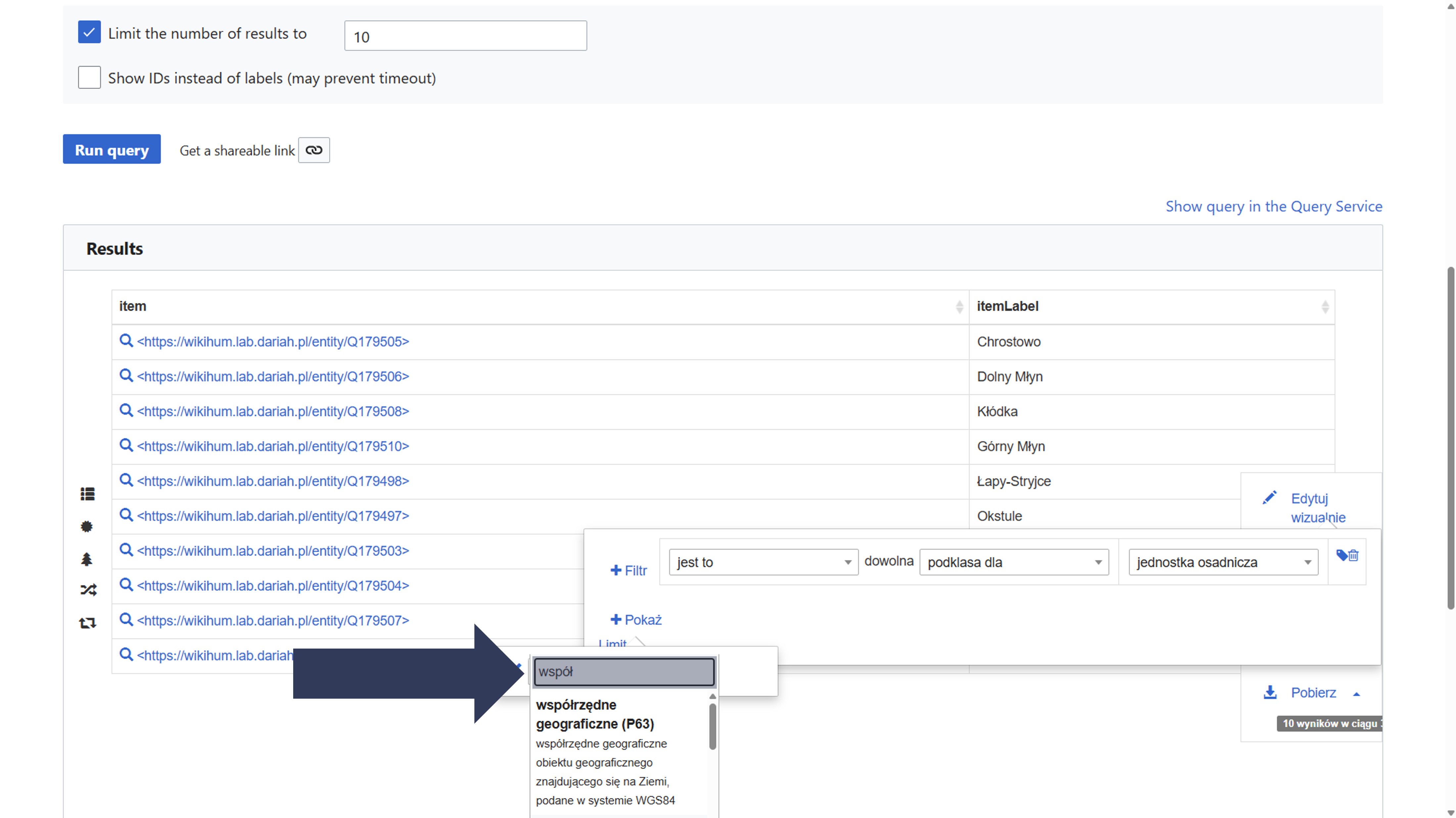 - Wpisz nazwę właściwości (np. współrzędne geograficzne) lub jej identyfikator (np. P63).