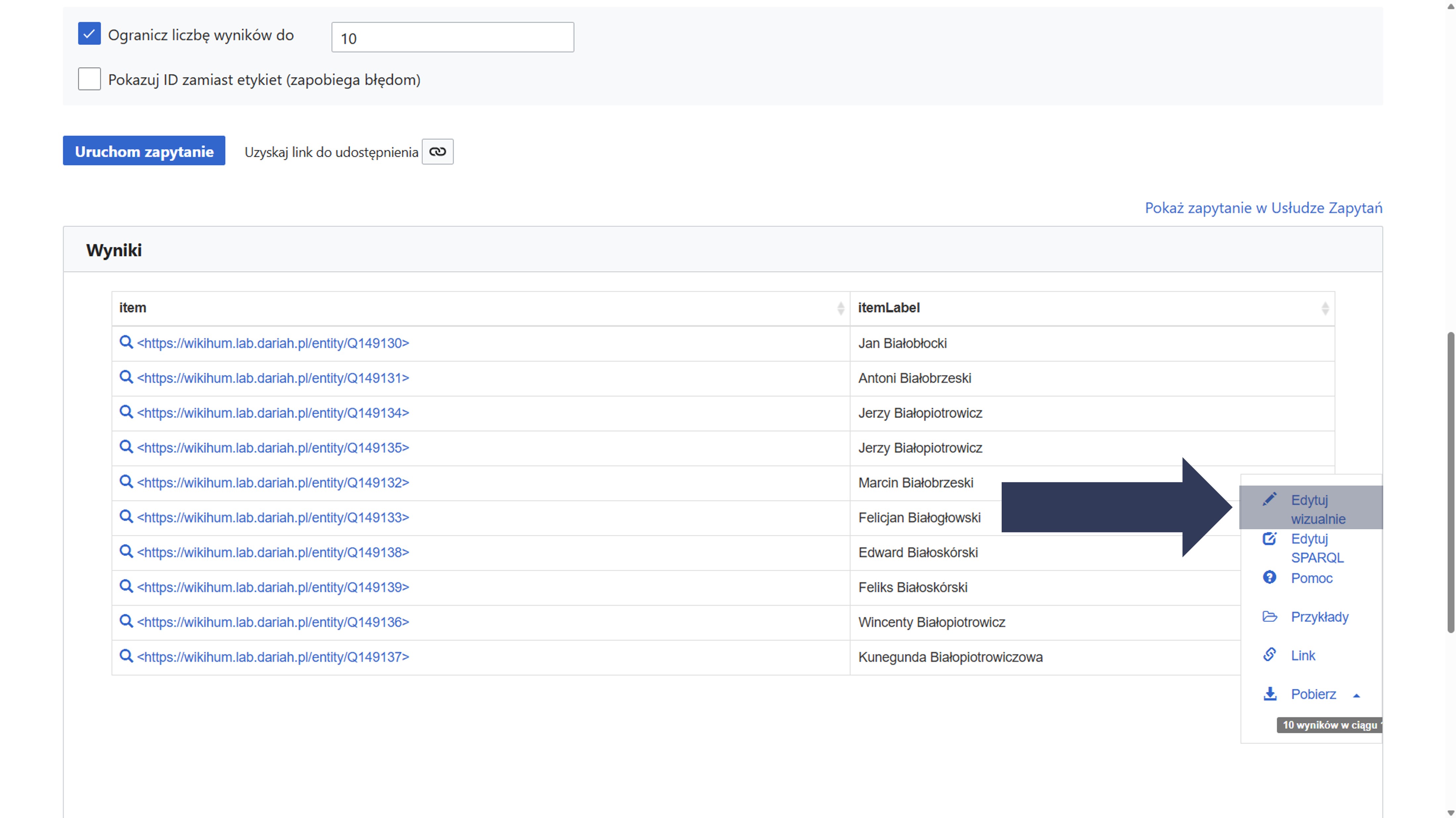 Aby edytować wizualnie wyniki zapytania: